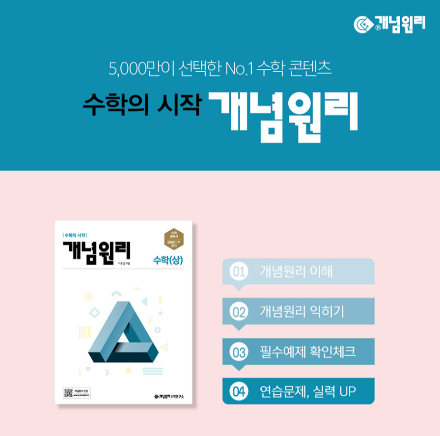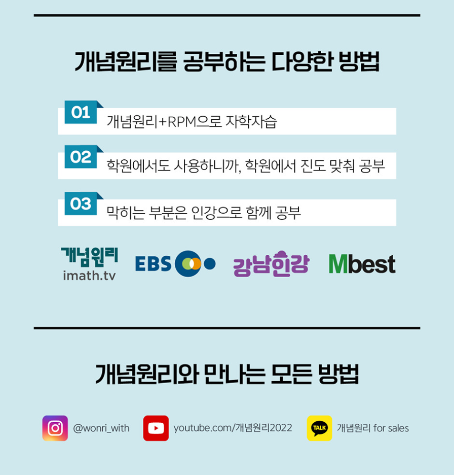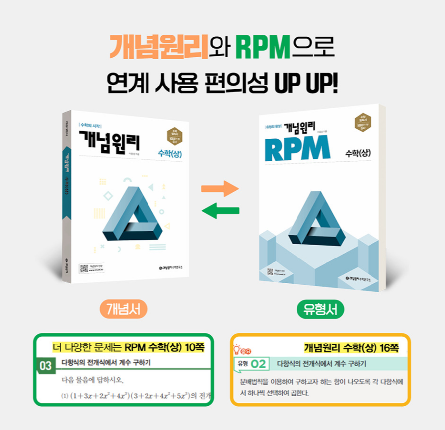 - 개념원리 + RPM: 문제를 통해 개념을 확실히 익힌 후, 관련 문제집을 풀어보는 구성이 효율적인 학습을 돕습니다.