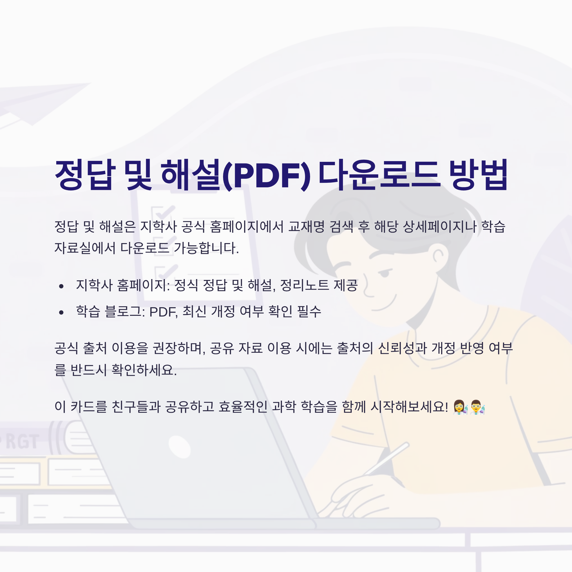 개념풀 통합과학2는 최신 교육과정(2022/2025 개정)을 반영한 과학 교재로, 개념 설명이 쉽고 단계별 문제 풀이로 시험 대비까지 가능합니다. 개념서, 시험대비책, 정리노트, 정답 및 해설 등으로 구성되어 있으며, 자기주도 학습이 가능하도록 학습법과 정리 포인트가 체계적으로 구성되어 있습니다. 정답 및 해설은 지학사 공식 홈페이지 또는 학습 블로그에서 PDF로 다운로드할 수 있습니다.