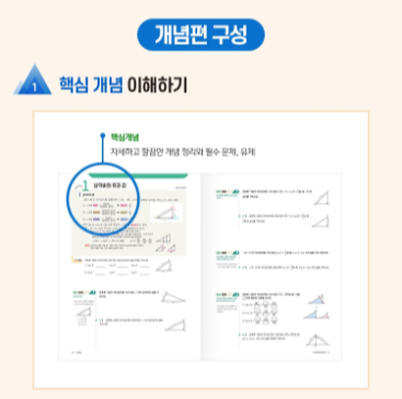 개념편은 수학의 기본 개념을 쉽게 이해할 수 있도록 상세히 설명하고 있습니다. 각 개념은 깔끔하게 정리되어 있으며, 부가 설명을 통해 학생들이 어려움을 겪지 않도록 돕습니다. 특히, 서술형 문제를 해결하는 방법도 제시하여 내신 대비에 효과적입니다.