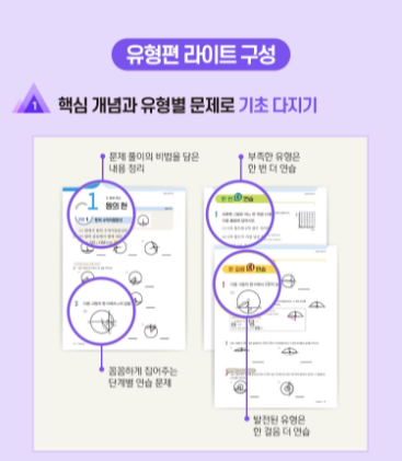 유형편 라이트는 개념을 확인하고 기초 문제를 연습할 수 있는 부분으로 구성되어 있습니다. 학생들이 자주 틀리는 문제 유형을 반복적으로 학습할 수 있도록 설계되었으며, 기초 계산력을 강화하기 위한 특별 코너도 마련되어 있습니다.