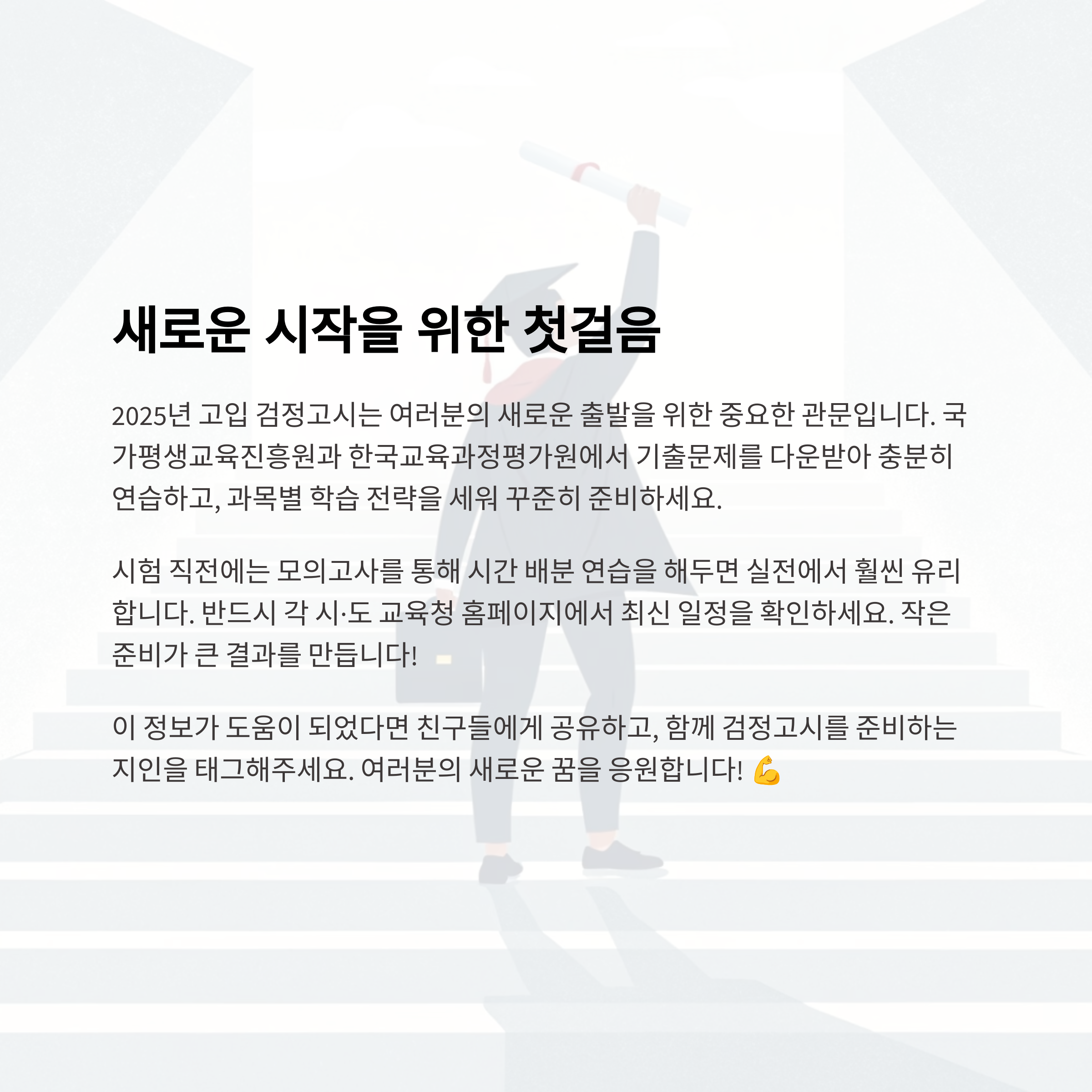 2025년 고입 검정고시는 새로운 출발을 위한 중요한 관문입니다. 국가평생교육진흥원, 한국교육과정평가원 등에서 기출문제를 다운받아 충분히 연습하고, 과목별 학습 전략을 세워 꾸준히 준비하세요. 특히 시험 직전에는 모의고사를 통해 시간 배분 연습을 해두면 실전에서 훨씬 유리합니다. 반드시 각 시·도 교육청 홈페이지에서 최신 일정을 확인한 뒤 접수에 차질 없도록 하세요. 작은 준비가 큰 결과를 만듭니다. 검정고시를 통해 새로운 꿈에 한 발짝 더 다가가길 바랍니다.