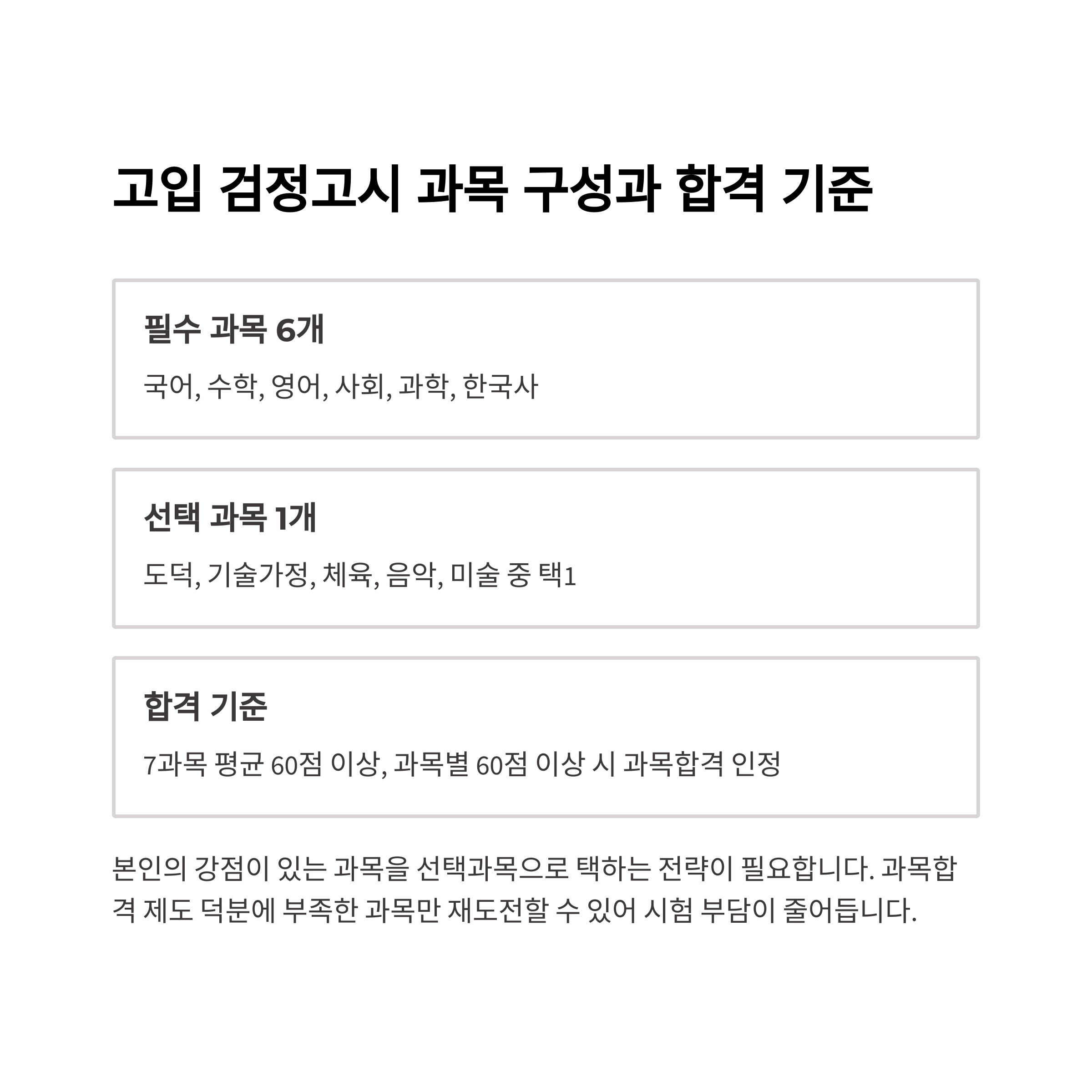 합격 기준은 7과목의 평균 점수가 60점 이상이면 합격으로 처리됩니다. 만약 평균이 60점에 미치지 못하더라도, 각 과목에서 60점 이상 받은 과목은 ‘과목 합격’으로 인정받아 이후 검정고시에서 해당 과목은 면제됩니다. 덕분에 시험에 대한 부담이 다소 줄어들 수 있고, 부족한 과목만 재도전할 수 있습니다.