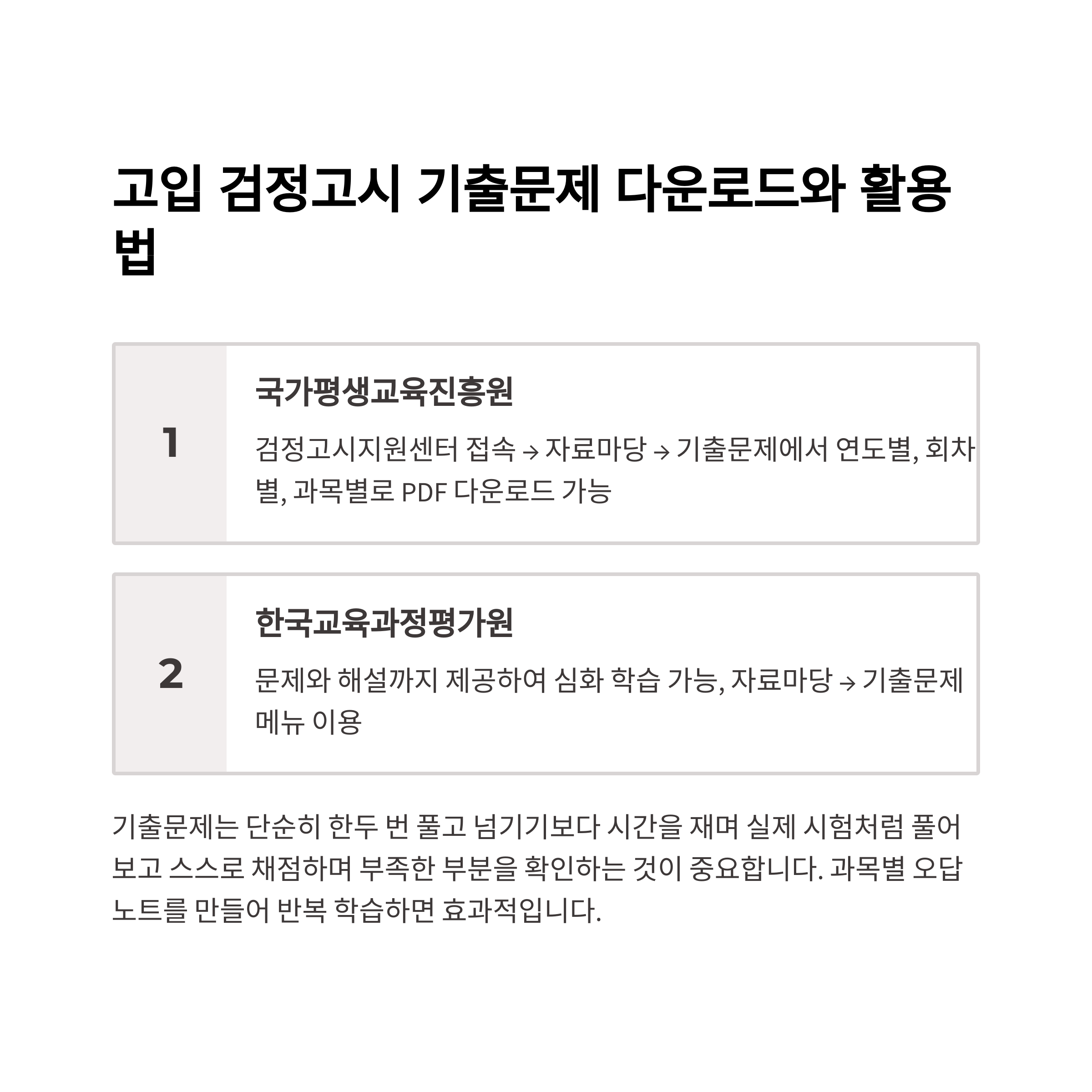 기출문제를 단순히 한두 번 풀고 넘기기보다는, 시간을 재며 실제 시험처럼 풀어보고 스스로 채점하며 부족한 부분을 확인하는 것이 중요합니다. 과목별로 오답노트를 만들어 반복적으로 학습하면 효과가 크며, 특히 수학이나 영어 같은 과목은 자주 틀리는 문제 유형을 집중적으로 복습하세요.