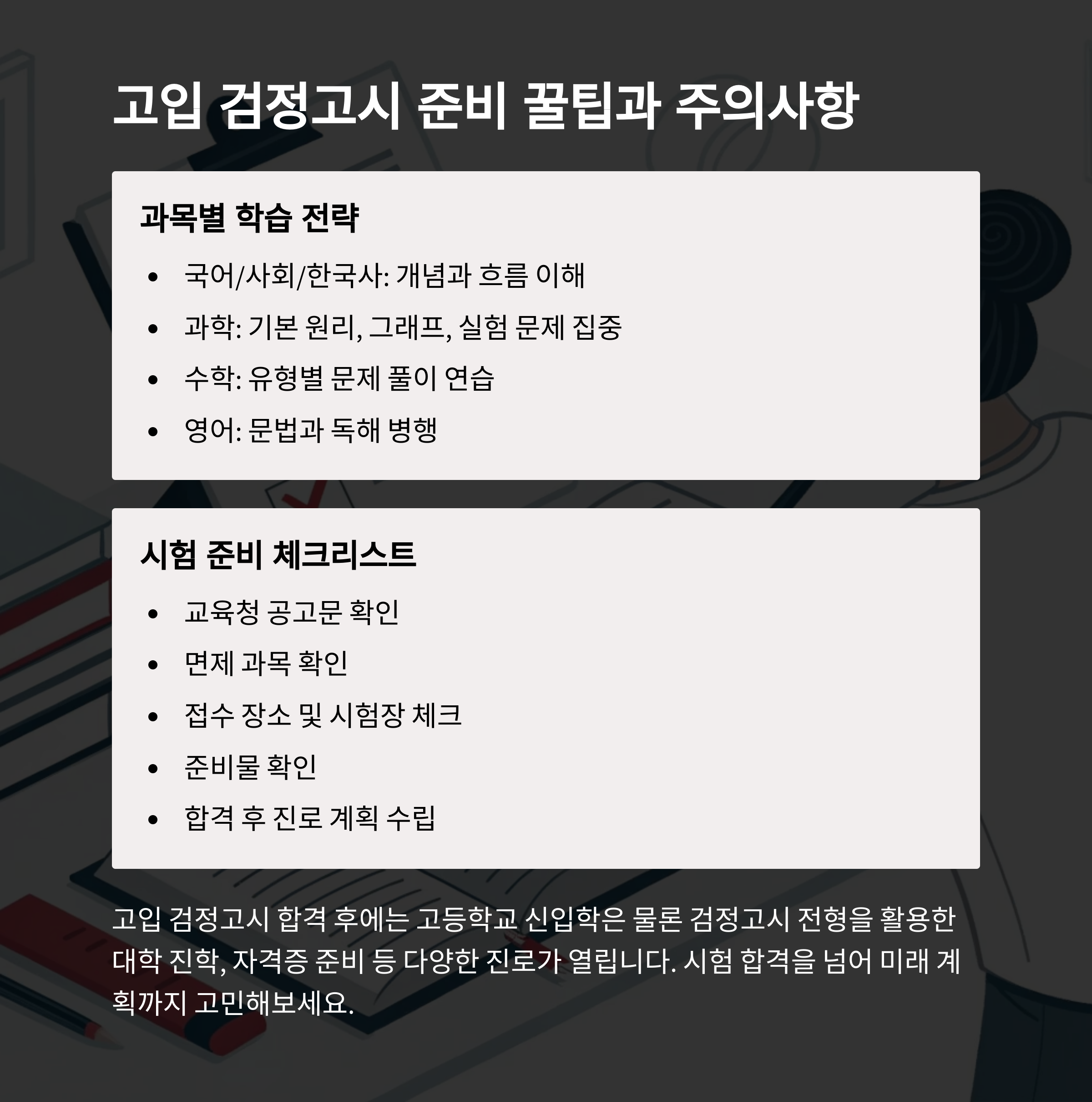 2025년 고입 검정고시는 새로운 출발을 위한 중요한 관문입니다. 국가평생교육진흥원, 한국교육과정평가원 등에서 기출문제를 다운받아 충분히 연습하고, 과목별 학습 전략을 세워 꾸준히 준비하세요. 특히 시험 직전에는 모의고사를 통해 시간 배분 연습을 해두면 실전에서 훨씬 유리합니다. 반드시 각 시·도 교육청 홈페이지에서 최신 일정을 확인한 뒤 접수에 차질 없도록 하세요. 작은 준비가 큰 결과를 만듭니다. 검정고시를 통해 새로운 꿈에 한 발짝 더 다가가길 바랍니다.