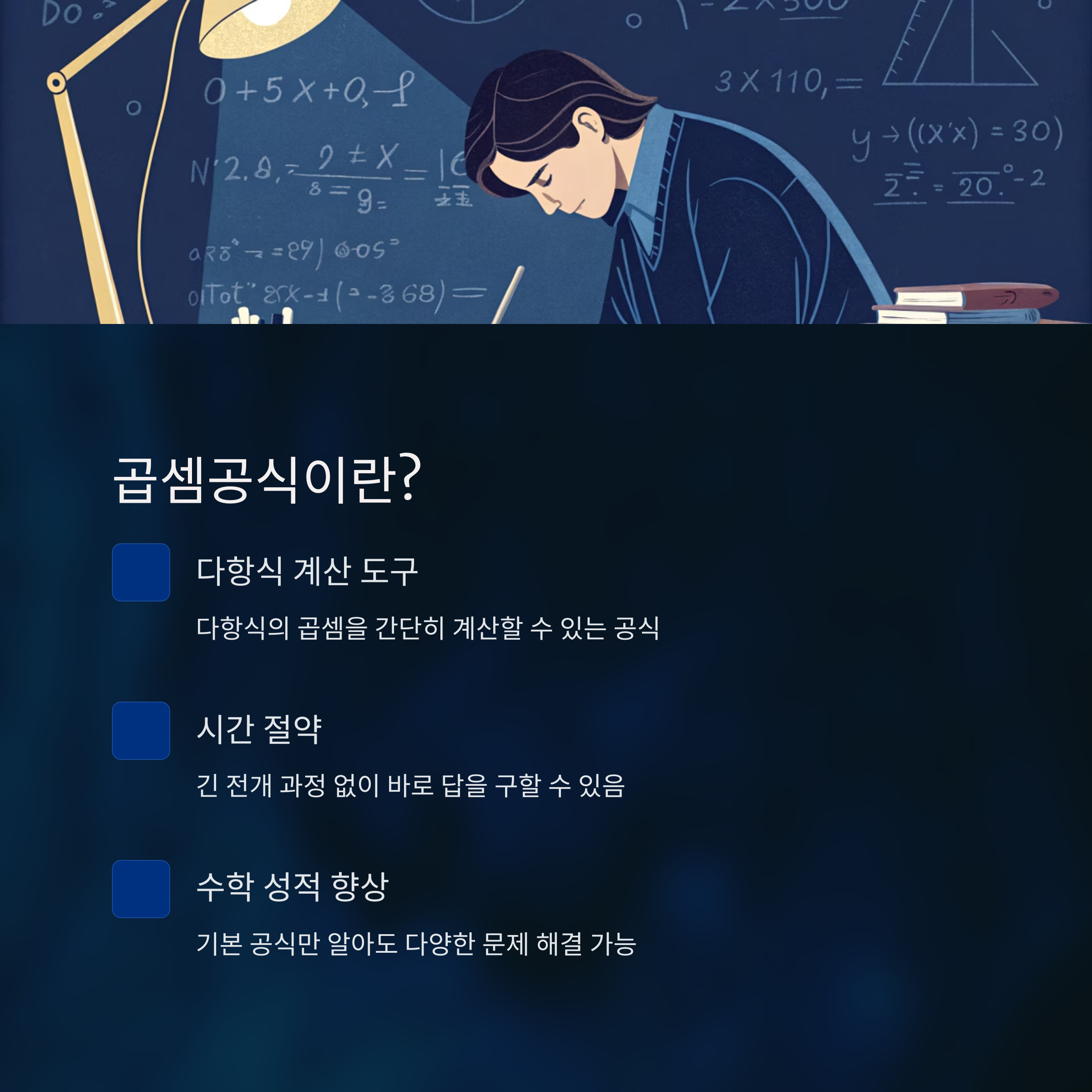많은 학생들이 수학 문제를 풀 때 공식을 외우는 것을 힘들어합니다. 그러나 곱셈공식은 단순히 암기해야 하는 내용이 아니라 문제를 빠르게 풀 수 있게 해 주는 강력한 도구입니다. 예를 들어 다항식을 전개하거나 인수분해할 때, 이 공식을 알고 있으면 불필요한 계산 과정을 줄이고 시간과 노력을 아낄 수 있습니다.