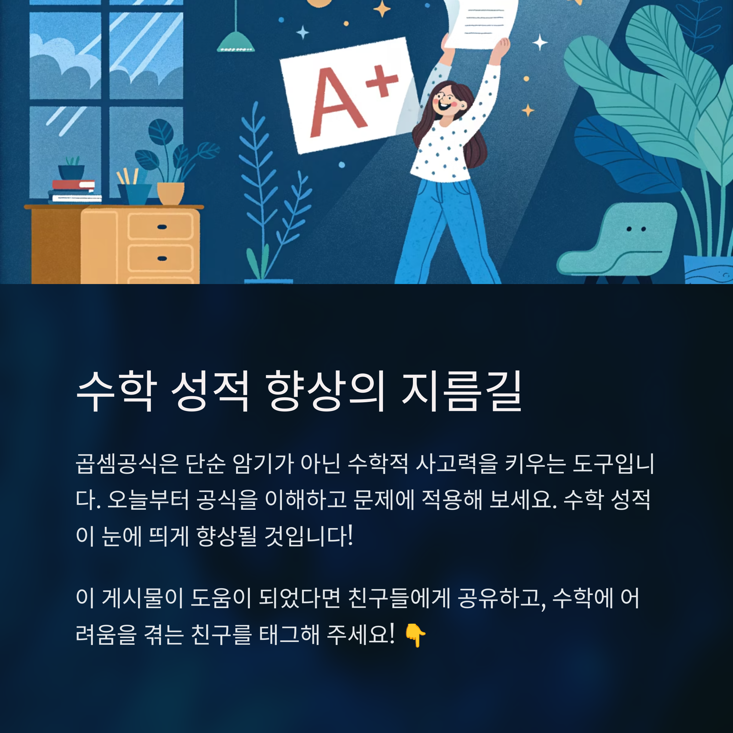 곱셈공식은 단순히 시험 점수를 올리기 위한 공식이 아닙니다. 수학적 사고력을 키우고 문제를 빠르고 정확하게 푸는 능력을 길러줍니다. 따라서 단순 암기에서 멈추지 말고, 공식을 이해하고 직접 활용해 보는 것이 중요합니다.