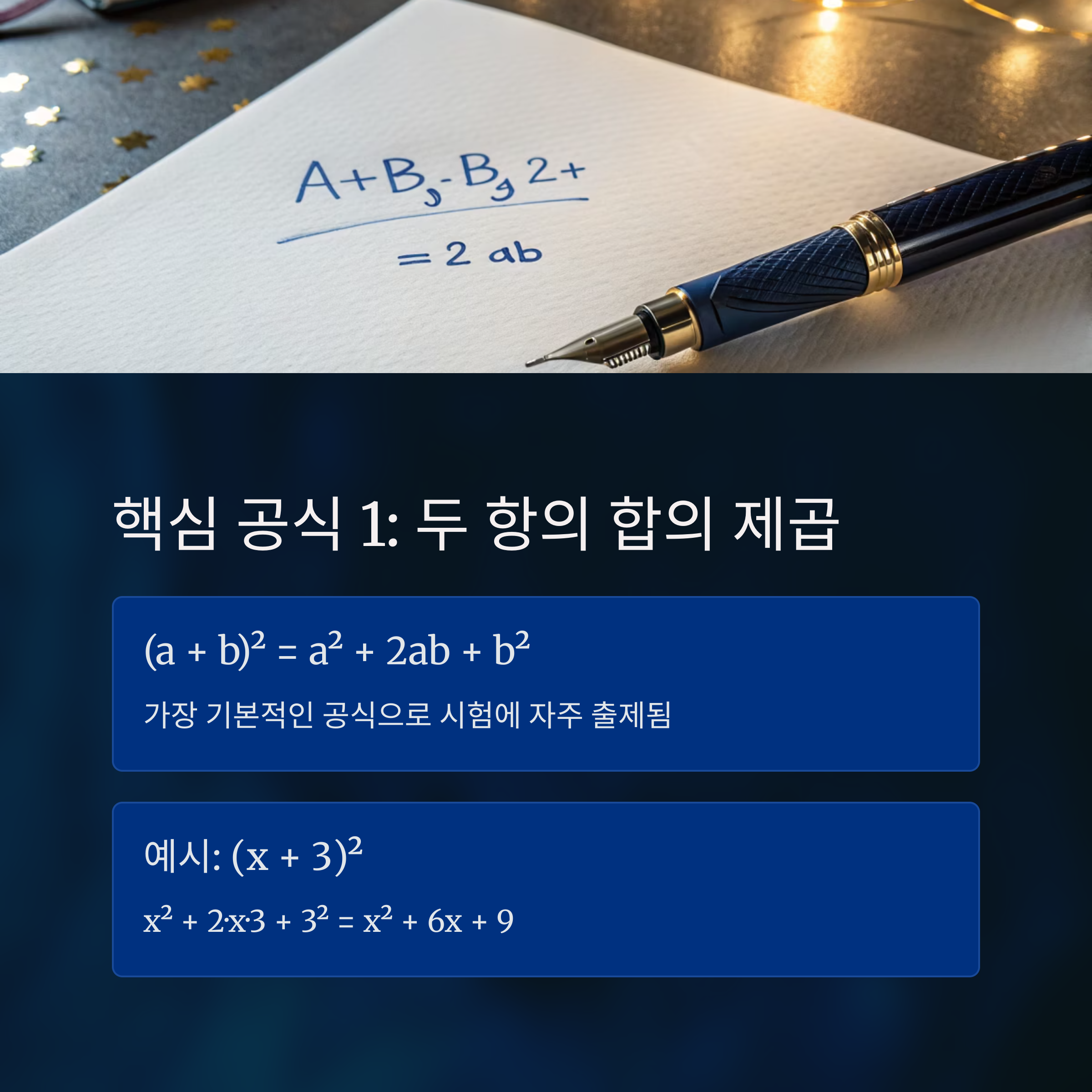 가장 기본적인 공식으로, 두 항의 합의 제곱을 나타냅니다. 예를 들어 (x + 3)²은 x² + 2·x·3 + 3² = x² + 6x + 9로 전개됩니다. 이 공식은 제곱 공식 중에서 가장 많이 등장하며, 시험 문제에서도 자주 출제됩니다.