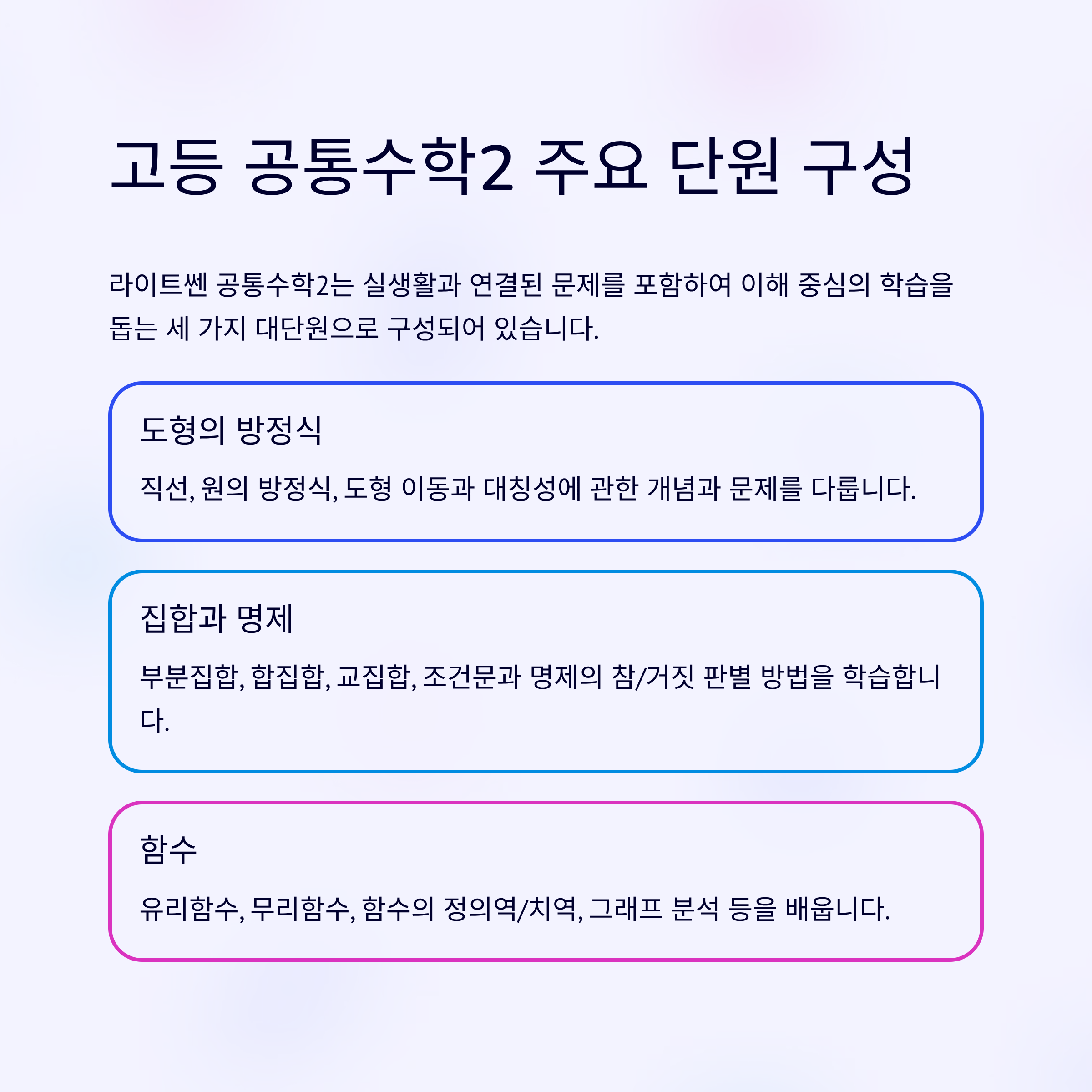 라이트쎈 공통수학2는 아래 세 가지 대단원을 포함하고 있으며,