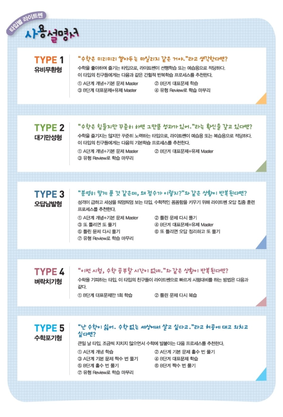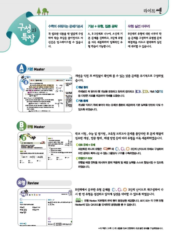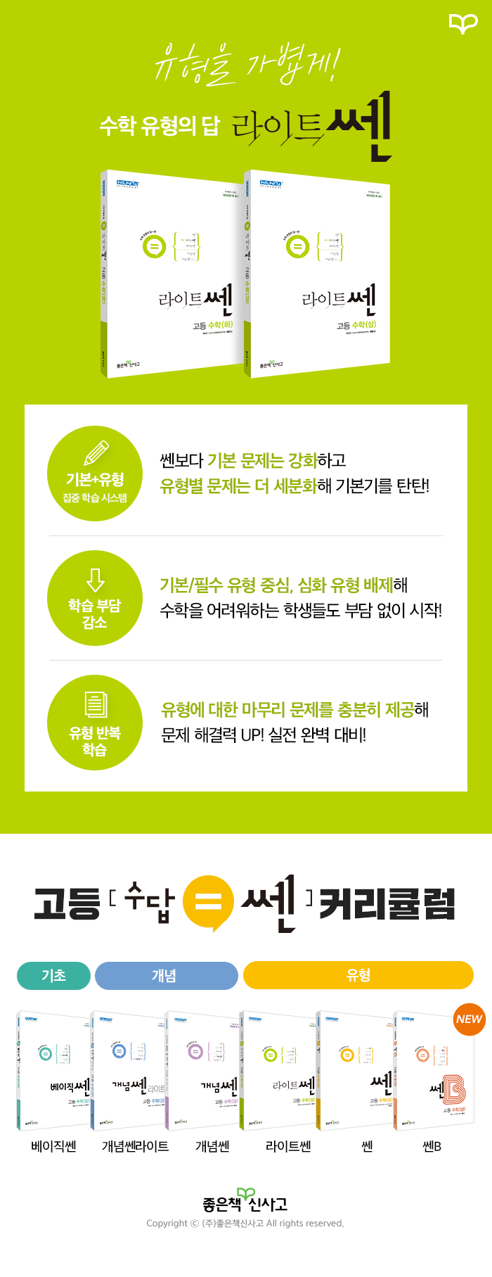 '라이트쎈'은 B단계의 유형에 대한 마무리 학습 문제를 구성하여 유형별 문제해결력을 키우고 완벽하게 실전에 대비할 수 있도록 하였습니다. 이를 통해 학생들은 실전에서도 자신감을 가지고 문제를 해결할 수 있을 것입니다.