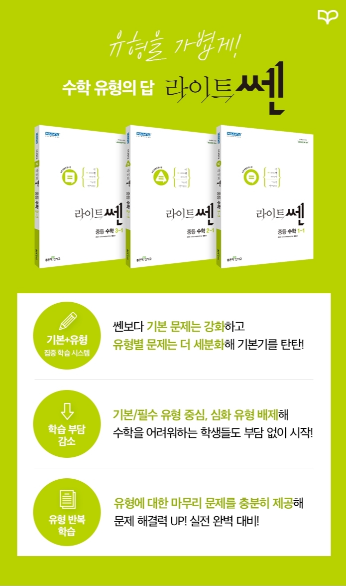 공부의 부담을 줄이며 수학을 어려워하는 학생들을 위한 최적의 학습 도구, '라이트쎈'의 특징에 대해 설명드리겠습니다.