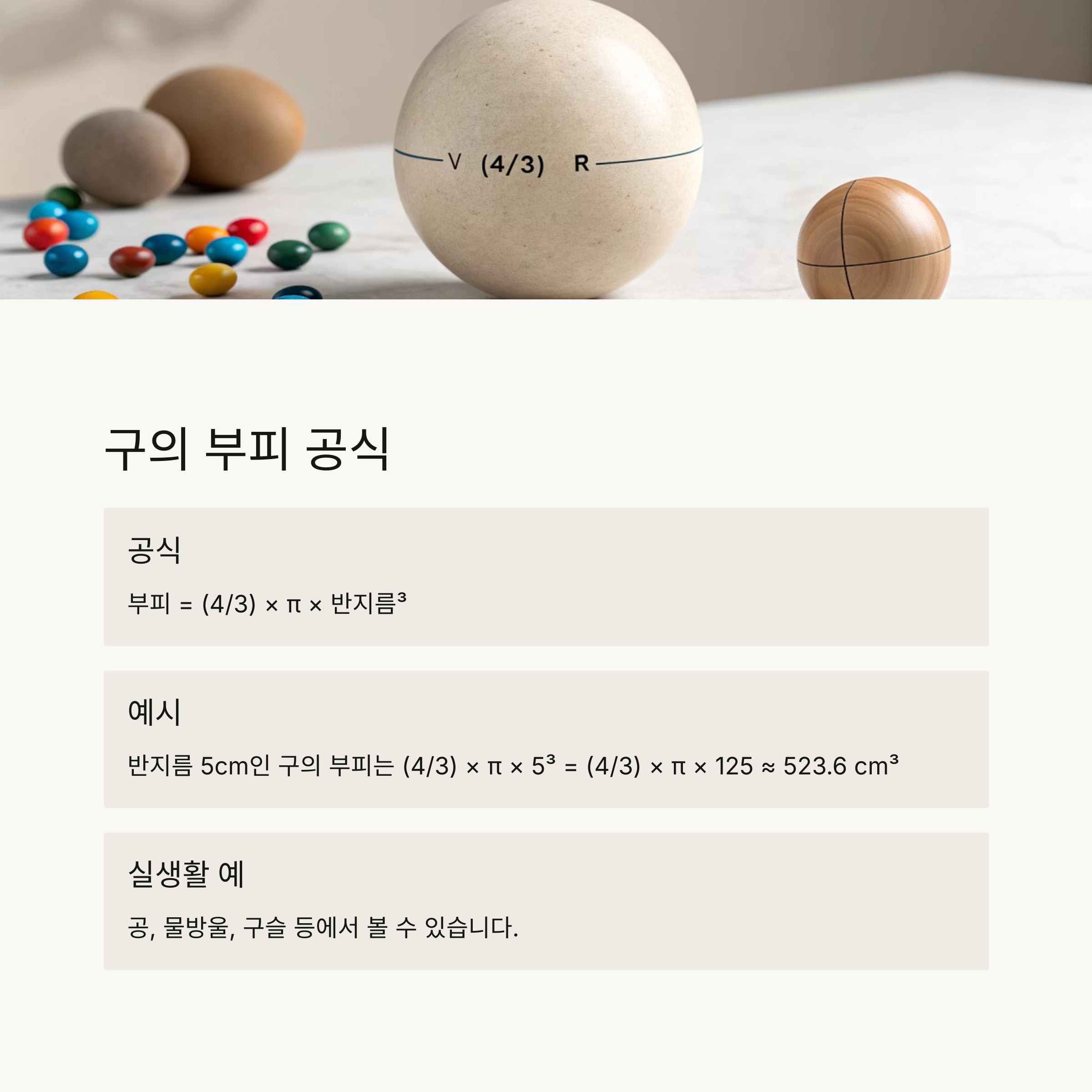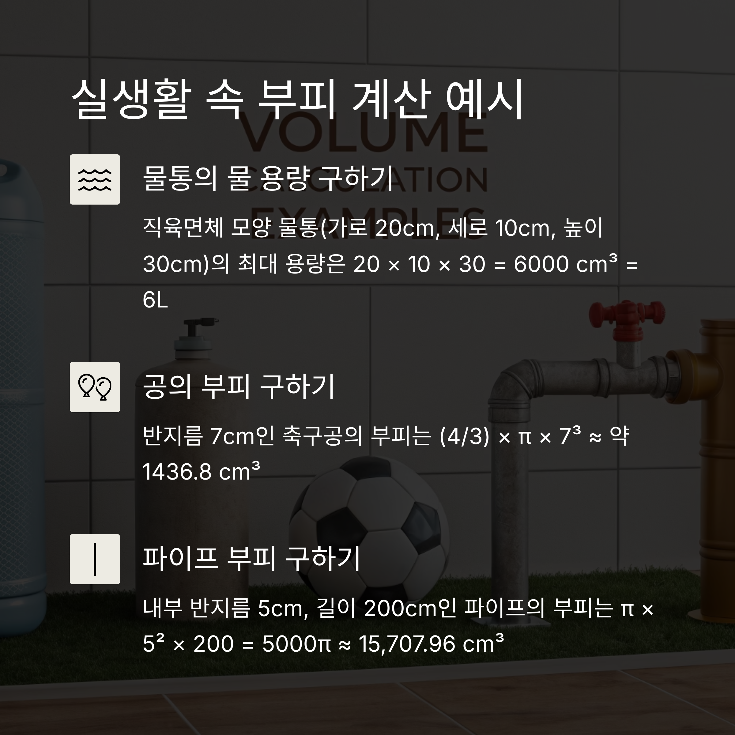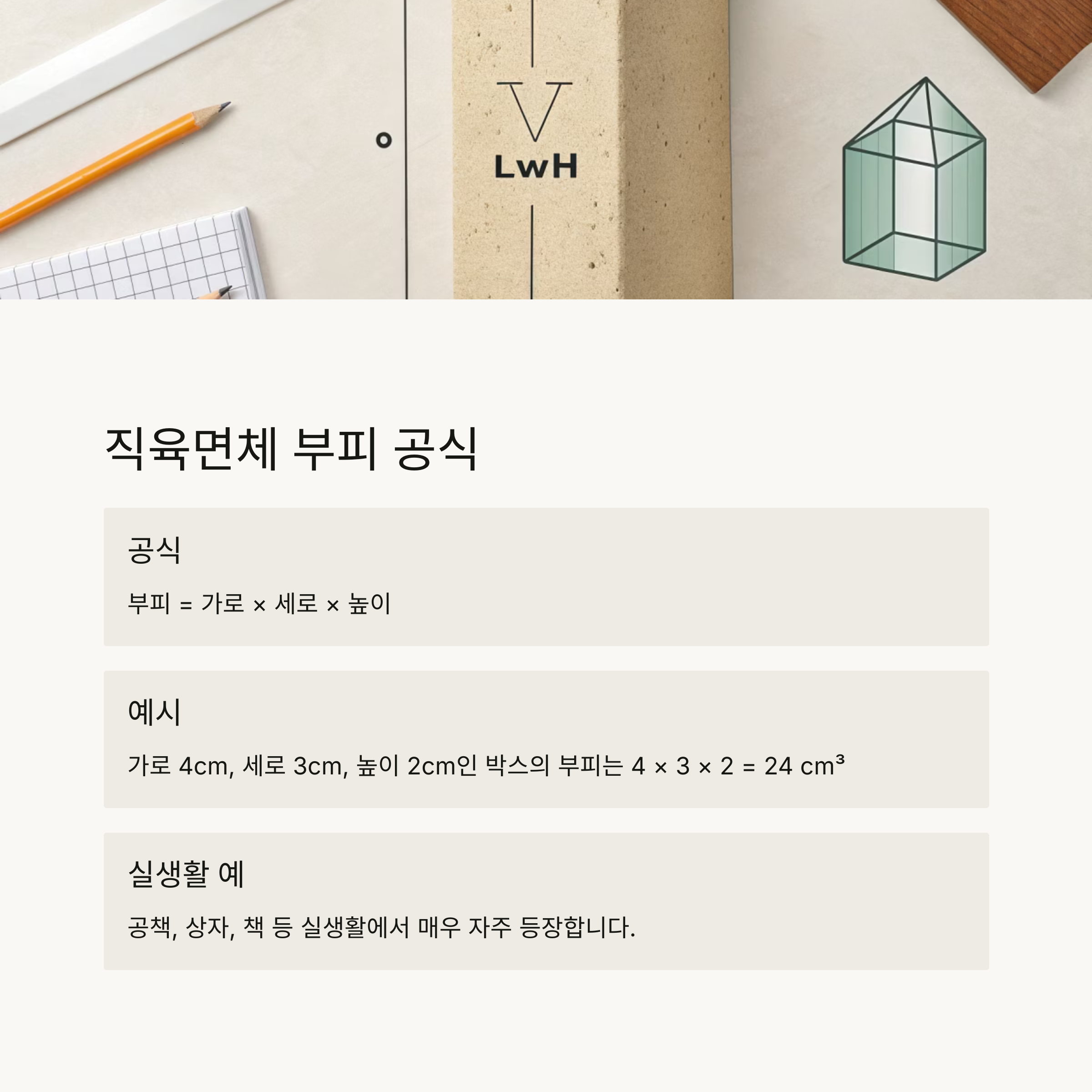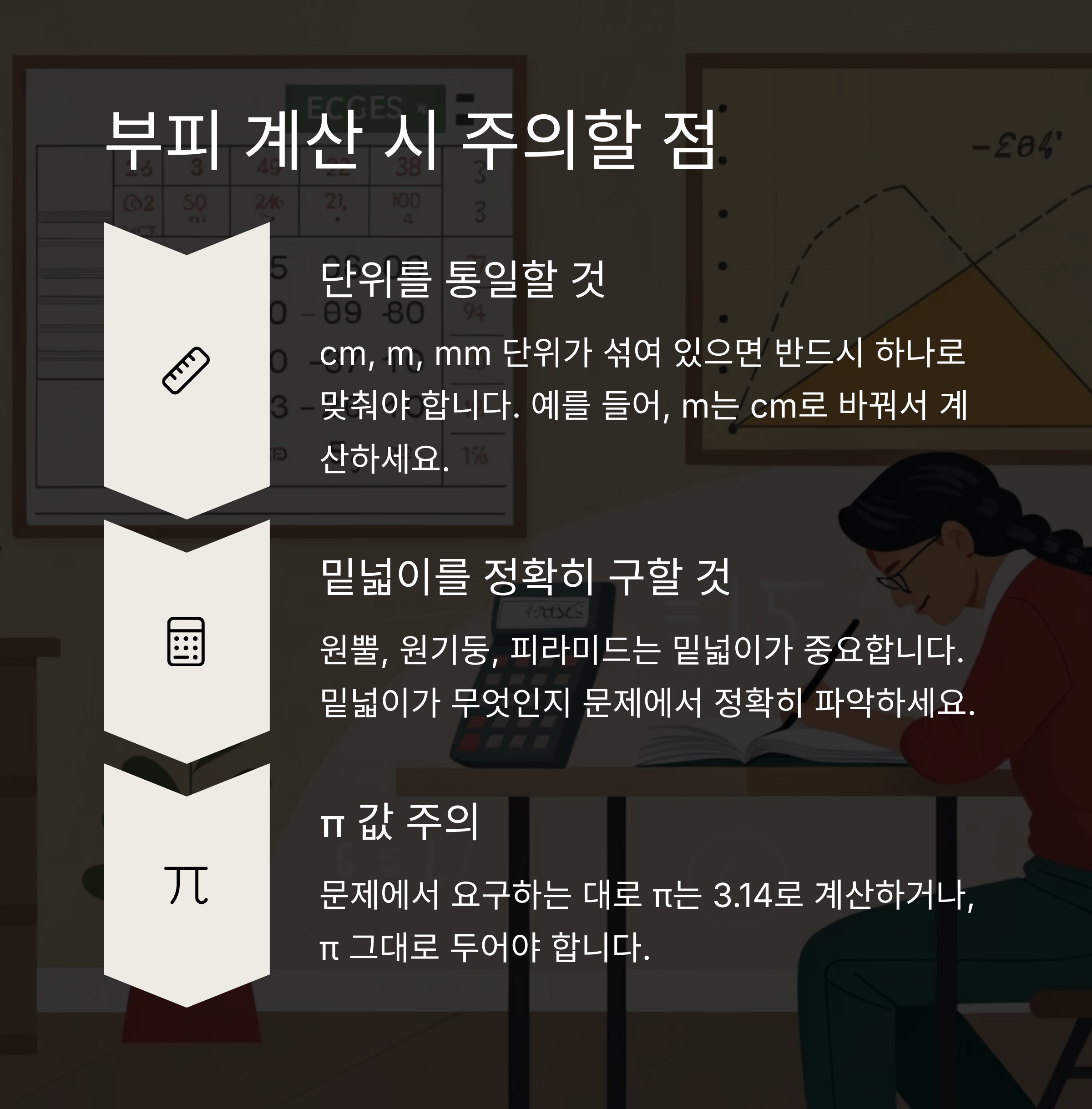 부피의 단위는 보통 cm³, m³, L(리터), mL(밀리리터) 등으로 표현되며, 주어진 단위를 잘 맞춰 계산하는 것도 중요합니다.