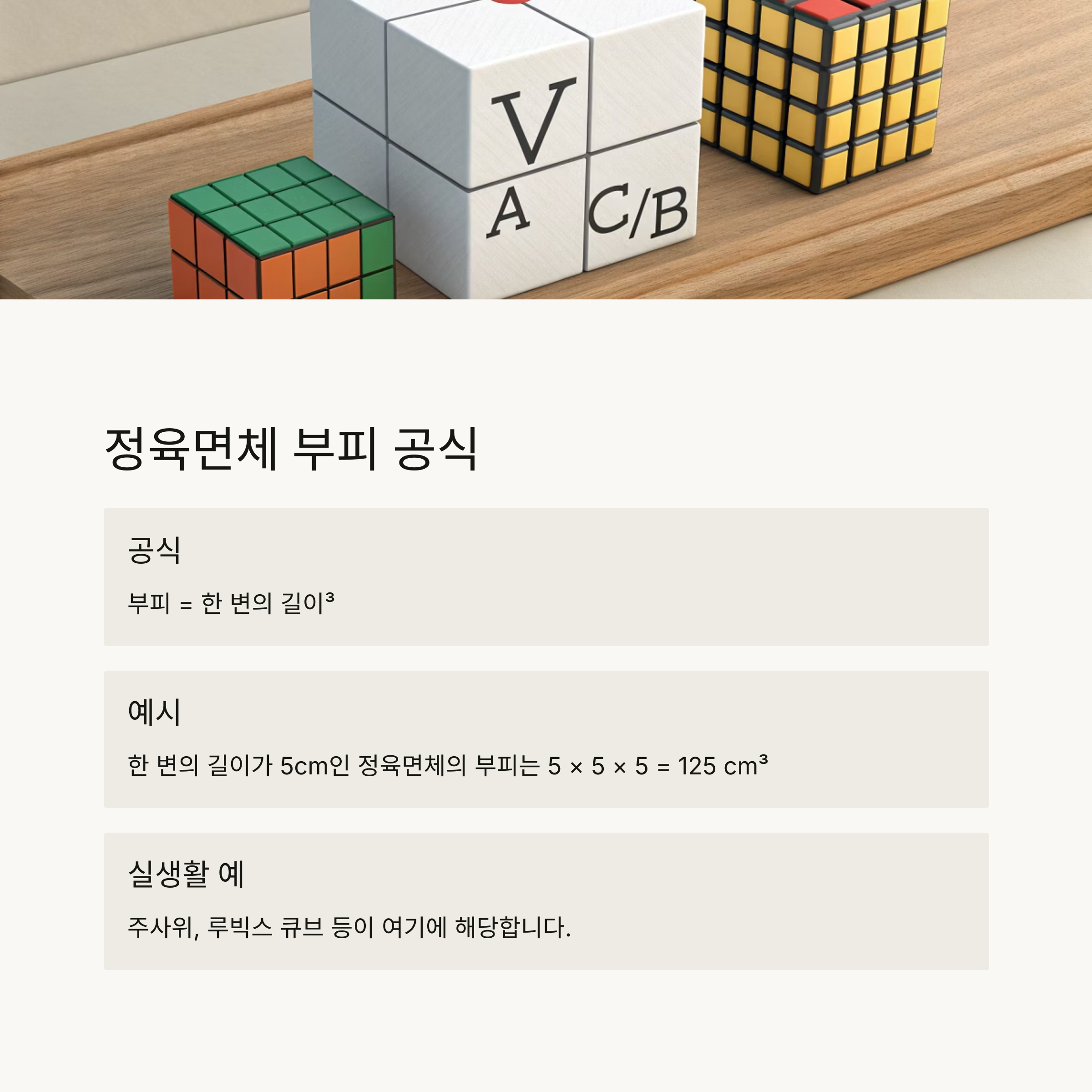 부피는 3차원 물체가 차지하는 공간의 크기입니다. 2차원 도형은 넓이로 크기를 측정하지만, 3차원 도형은 길이 × 넓이 × 높이 같은 계산을 통해 입체적으로 크기를 측정합니다.