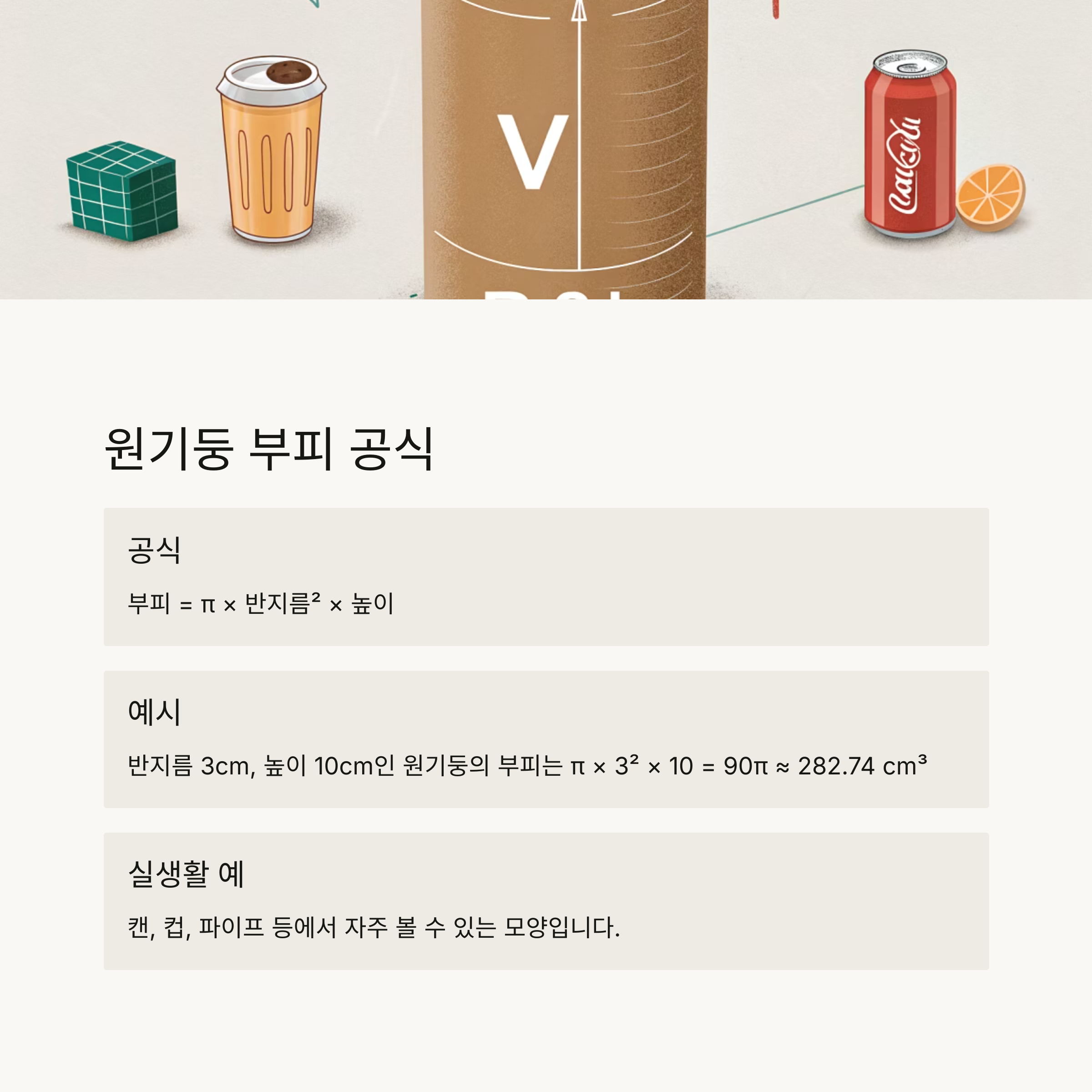 예: 반지름 3cm, 높이 10cm인 원기둥의 부피는
