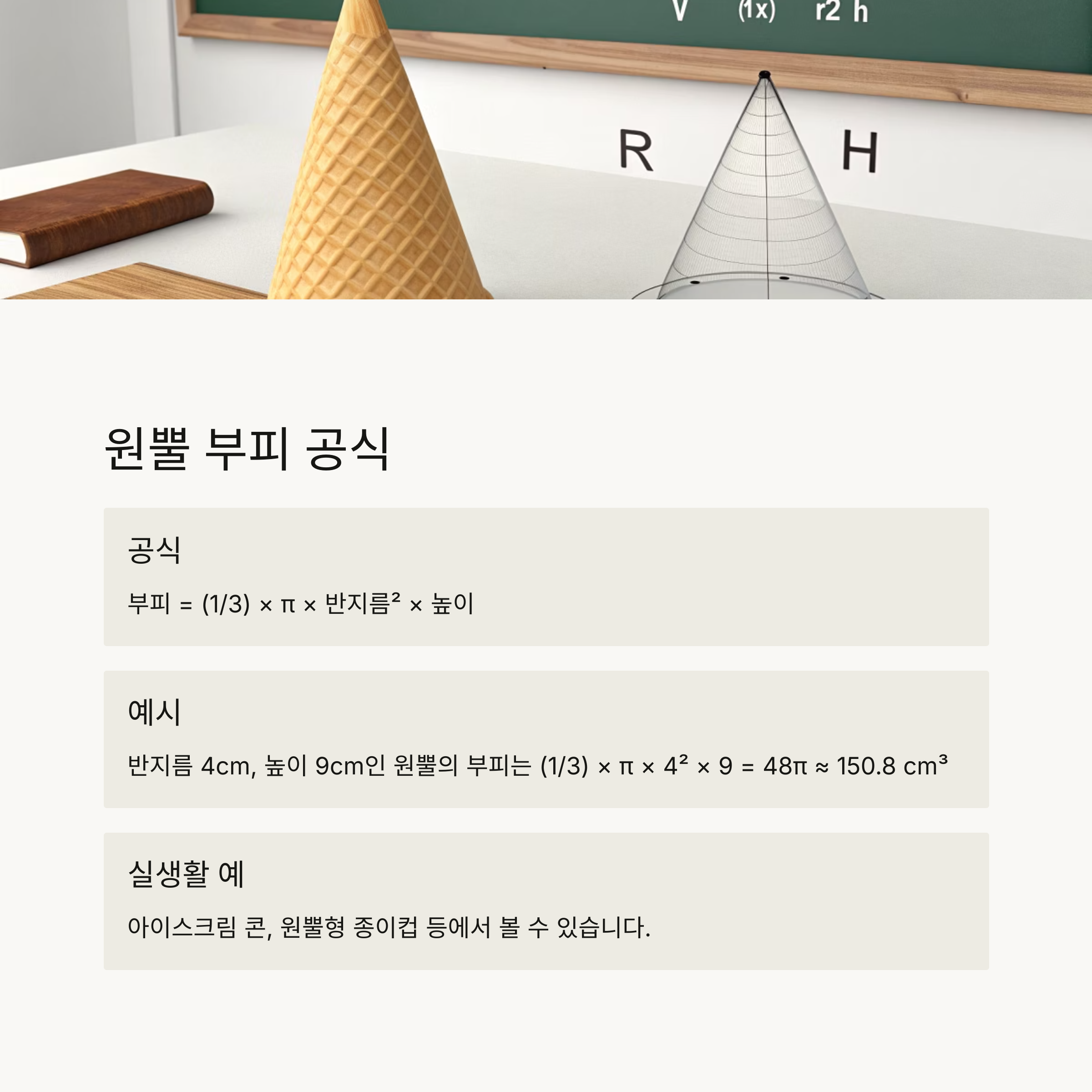 부피 = (1 ÷ 3) × 밑넓이 × 높이 = (1 ÷ 3) × π × 반지름² × 높이