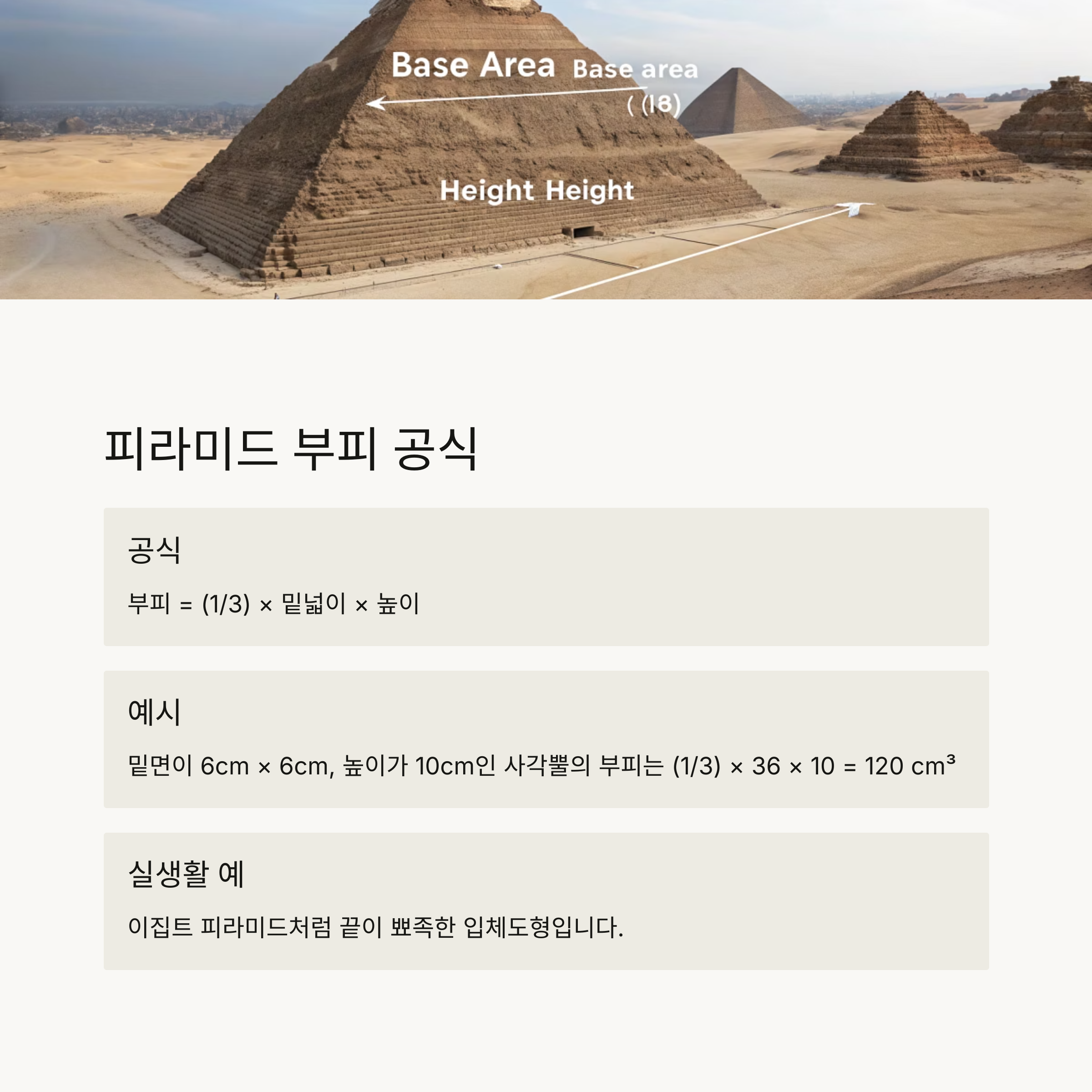 예: 밑면이 6cm × 6cm, 높이가 10cm인 사각뿔의 부피는