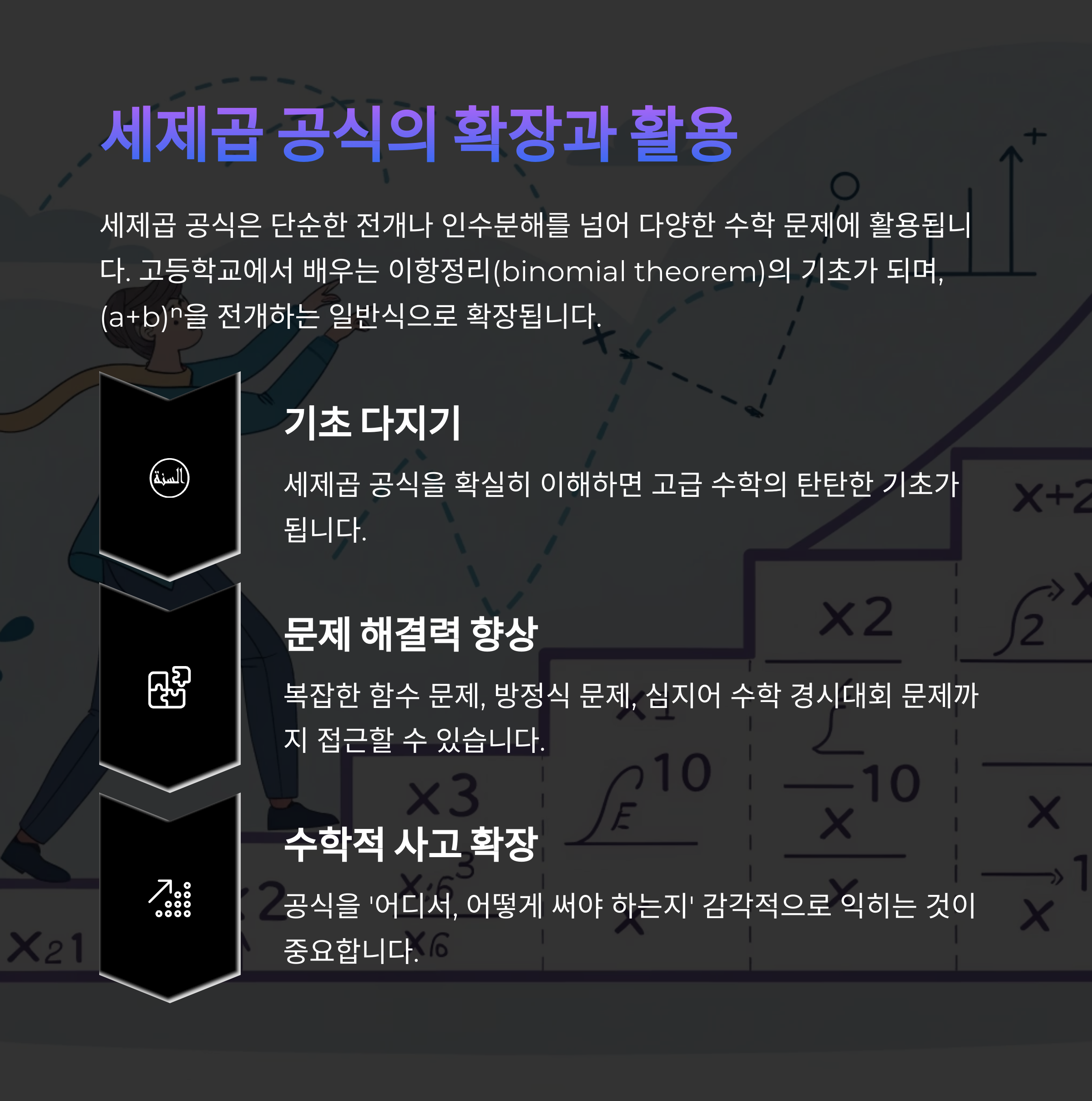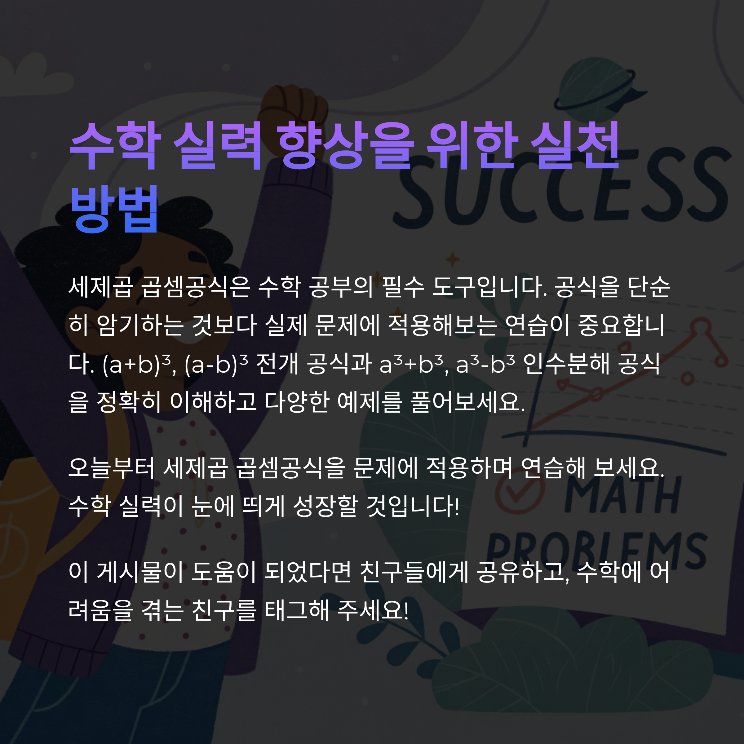 세제곱 공식을 알면 단순히 전개나 인수분해 문제를 빠르게 풀 수 있을 뿐 아니라, 더 복잡한 함수 문제, 방정식 문제, 심지어 수학 경시대회 문제까지 접근할 수 있는 도구가 됩니다.