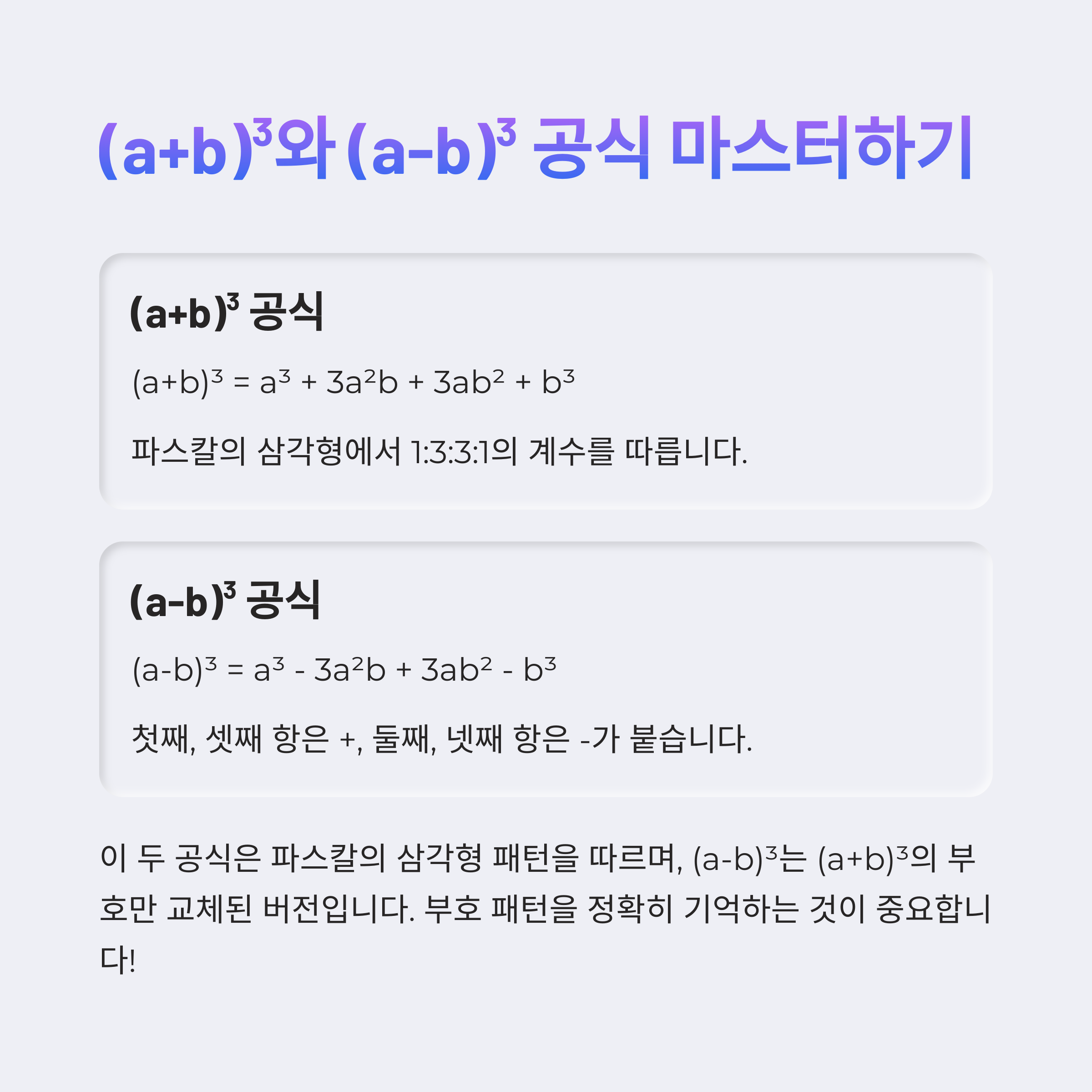 이 공식은 파스칼의 삼각형에서 1:3:3:1의 계수를 따릅니다. 각각 a³, a²b, ab², b³ 항이 들어가며, 중간의 두 항은 3배씩 등장합니다.