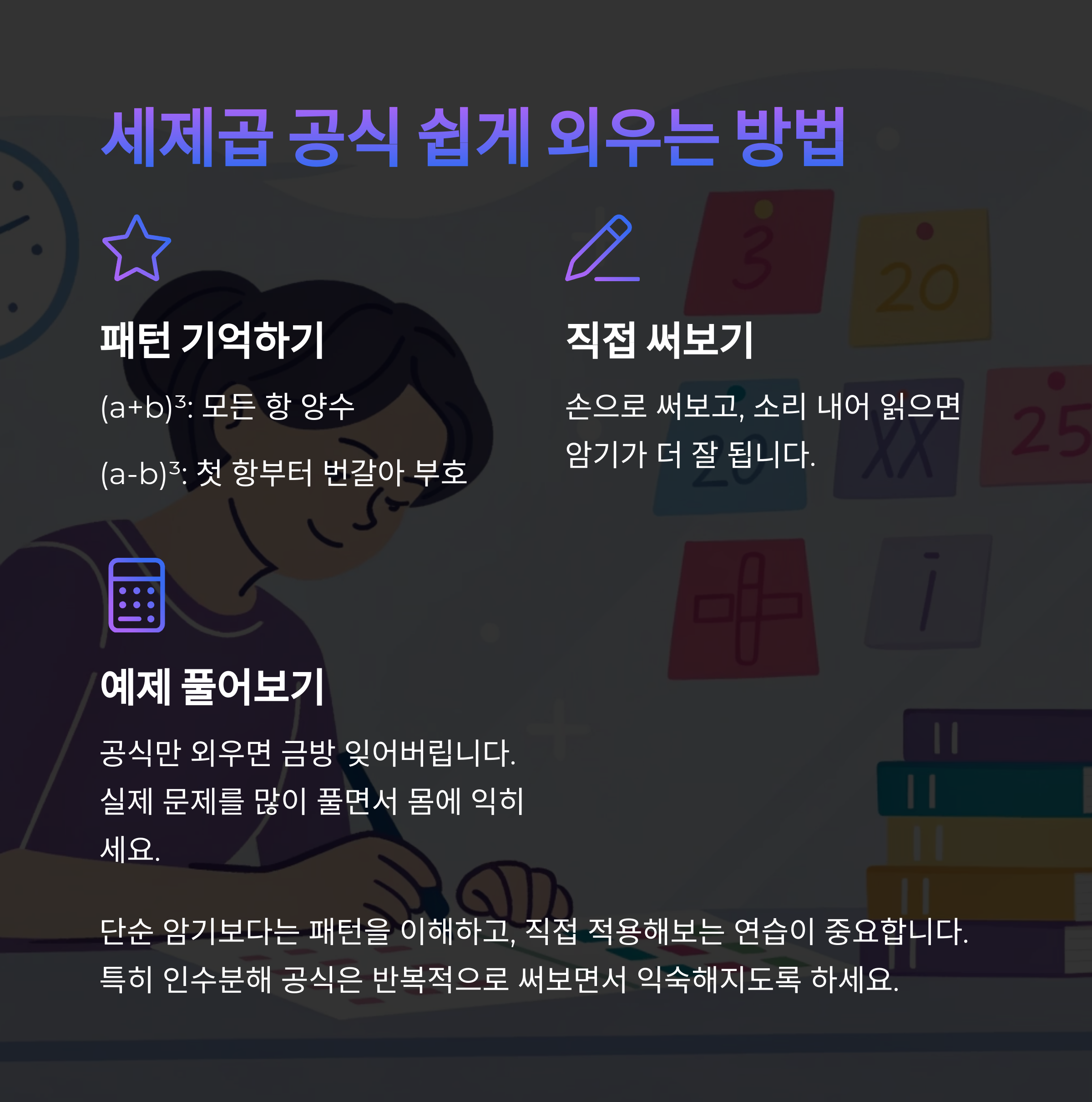 공식만 달달 외우는 학생과, 공식을 실제 문제에 적용해 보는 학생은 성적에서 큰 차이가 납니다. 세제곱 곱셈공식을 배우면 곧바로 예제 문제를 풀어보고, 모르는 문제는 왜 틀렸는지 분석해 보세요. 공식을 안다고 끝이 아닙니다. '어디서, 어떻게 써야 하는지'까지 감각적으로 익히는 것이 중요합니다.