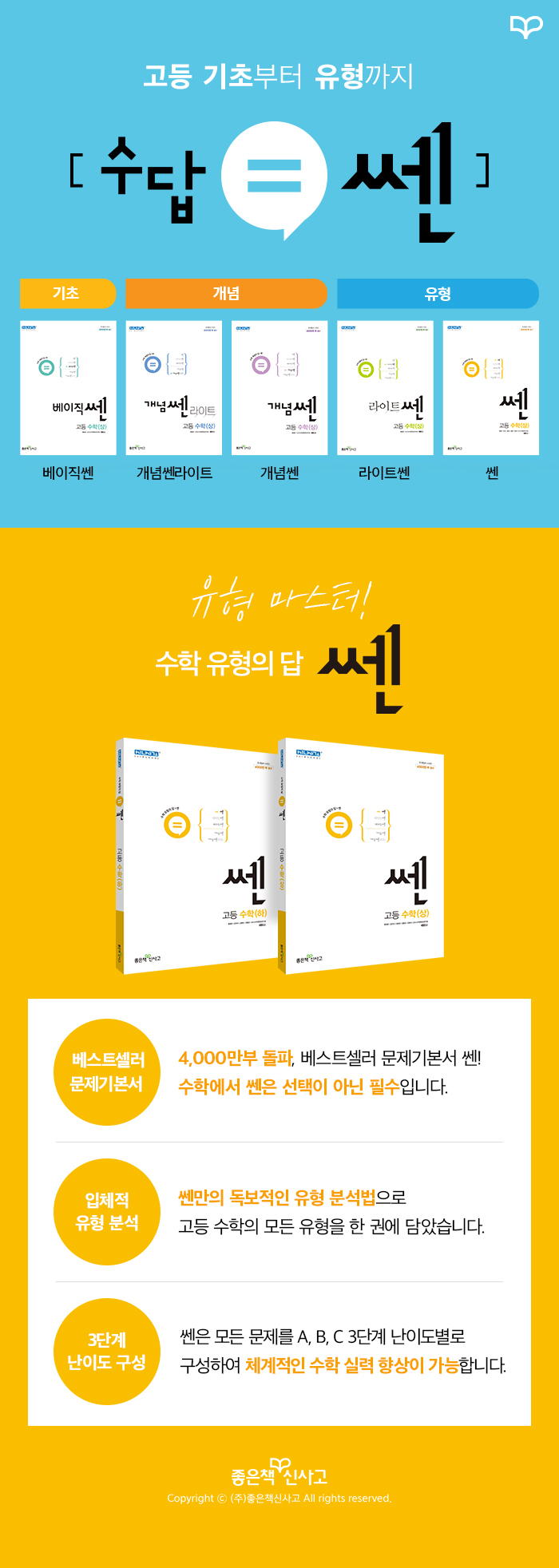 전국 고등학교 내신 기출 문제와 평가원·수능 기출 문제는 물론 수많은 기본서, 내신서, 수능서까지 분석하여 모든 수학 문제를 수집, 분류하여 강력한 유형 그물을 만들었기 때문에 쎈 한 권만으로도 충분한 문제 연습이 가능합니다.