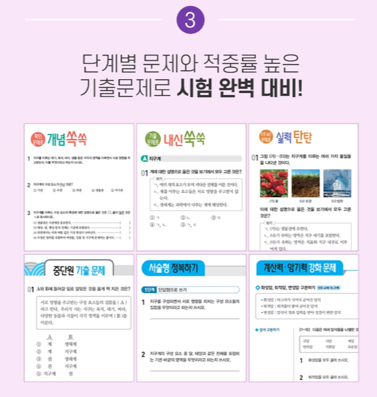 이 교재는 '개념+탐구+문제'의 세 가지 요소로 구성되어 있습니다. 먼저 과학 개념을 명확히 설명하고, 이를 기반으로 탐구 활동을 통해 실습할 수 있습니다. 마지막으로 다양한 문제를 통해 학습한 내용을 복습하고, 내신 시험에 대비할 수 있습니다.