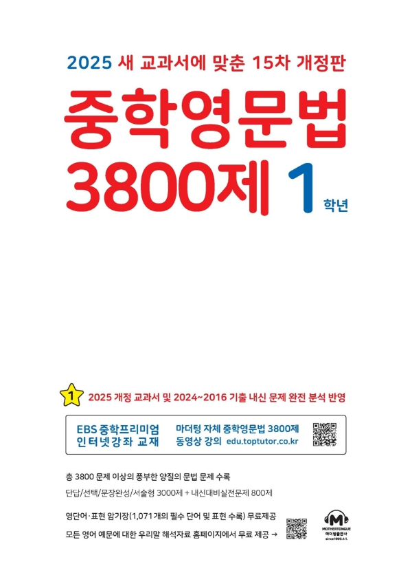 중학영문법 3800제 1학년(2025)는 중학교 1학년 학생을 대상으로 영어 문법을 탄탄히 다질 수 있도록 설계된 교재입니다. 이 교재는 전국 중학교의 중간·기말고사에서 빈출되는 문제 유형을 철저히 분석하여 최신 개정 교과서 14종을 반영하고 있습니다. 특히 내신 성적 향상과 특목고 진학을 목표로 하는 학생들이 필수적으로 익혀야 할 문법 사항을 체계적으로 다루고 있어 학부모와 학생들 모두에게 큰 인기를 얻고 있습니다.