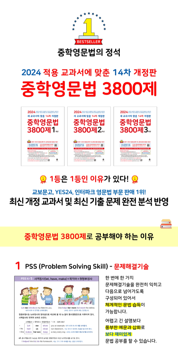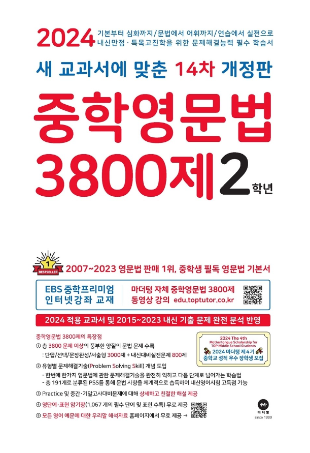 중학영문법 3800제 2학년(2024년)은 전국 중학교에서 출제된 중간, 기말고사 문법 문제를 철저히 분석하여 제작된 교재입니다. 최신 개정된 14종 교과서를 반영하여 학생들이 실제 시험에 대비할 수 있도록 구성되어 있으며, 단답형, 선택형, 문장완성형, 서술형 문제 3000제와 중간, 기말고사 대비 문제 800제를 포함하고 있습니다. 이번 글에서는 교재의 특장점 분석과 답지에 대한 안내 드리도록 하겠습니다.
