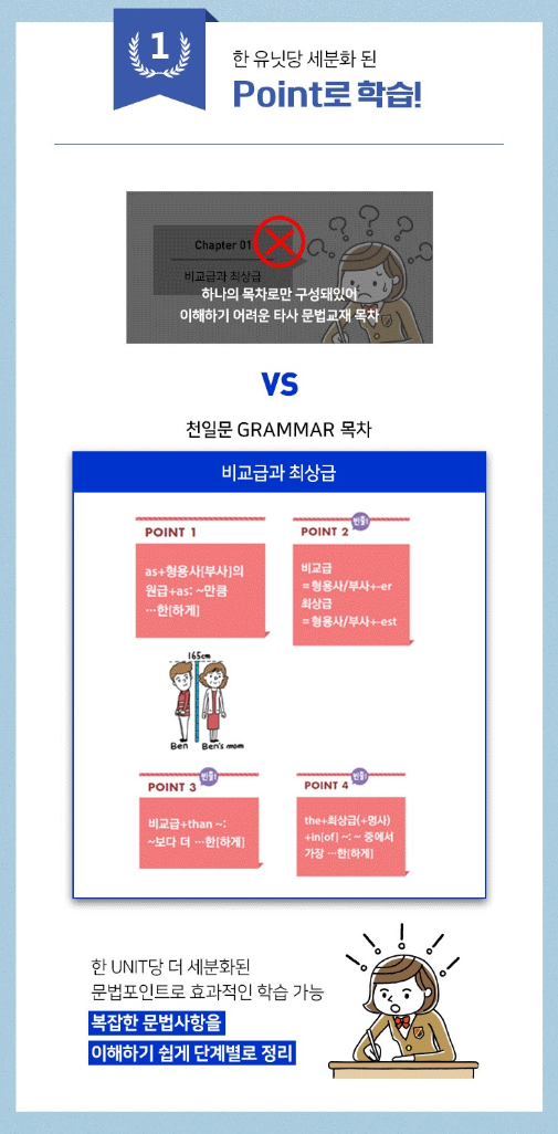 기존의 암기 위주의 영문법 학습과는 달리, 천일문 GRAMMAR는 예문을 통한 자연스러운 학습을 강조합니다. 기계적으로 규칙을 외우기보다, 실제로 활용할 수 있는 예문을 중심으로 학습해 문법을 체계적으로 이해할 수 있습니다.