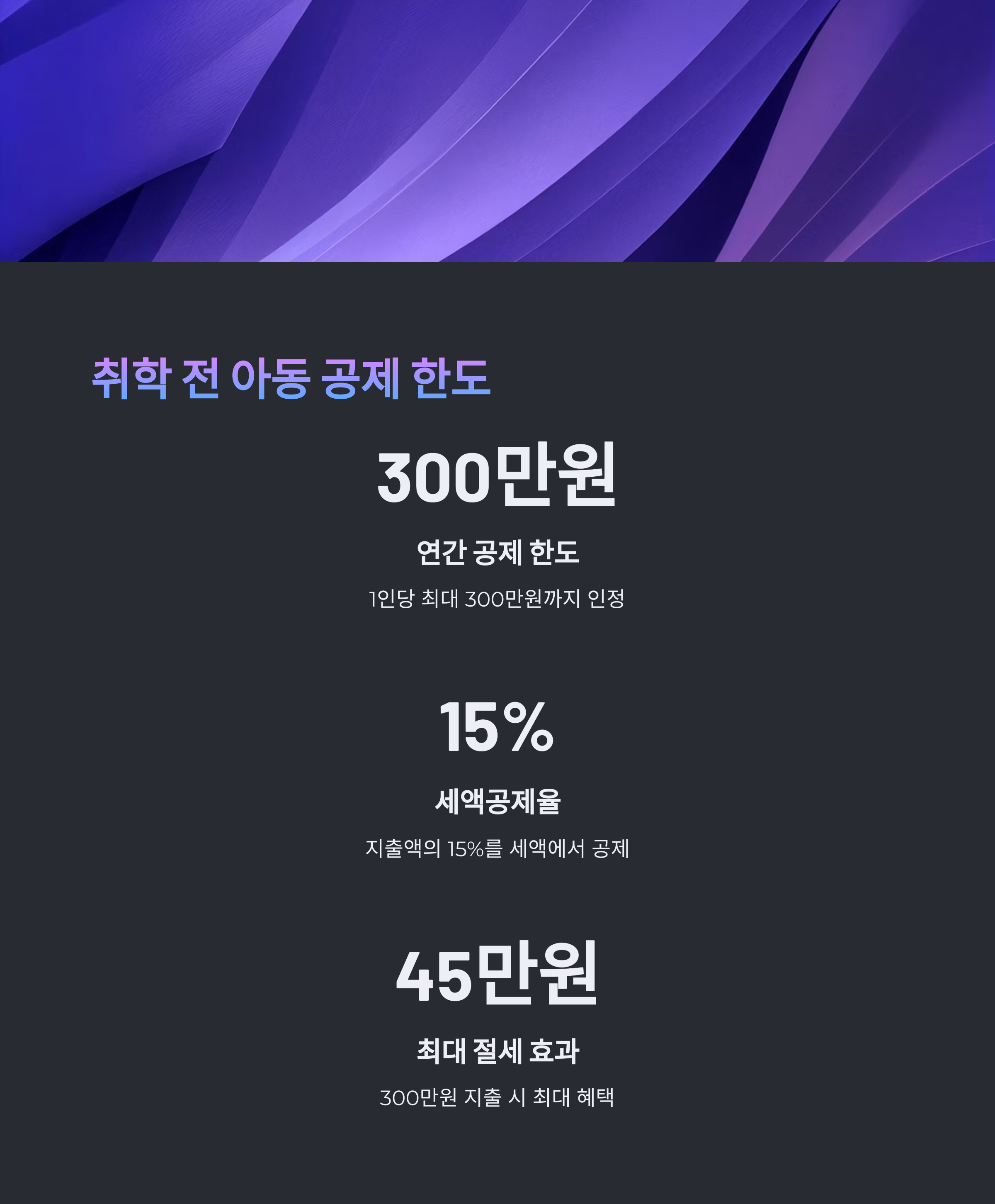 | 취학 전 아동 | 가능 | 연 300만 원/인 | 정식 학원, 주 1회 이상 수업, 증빙 필요 |