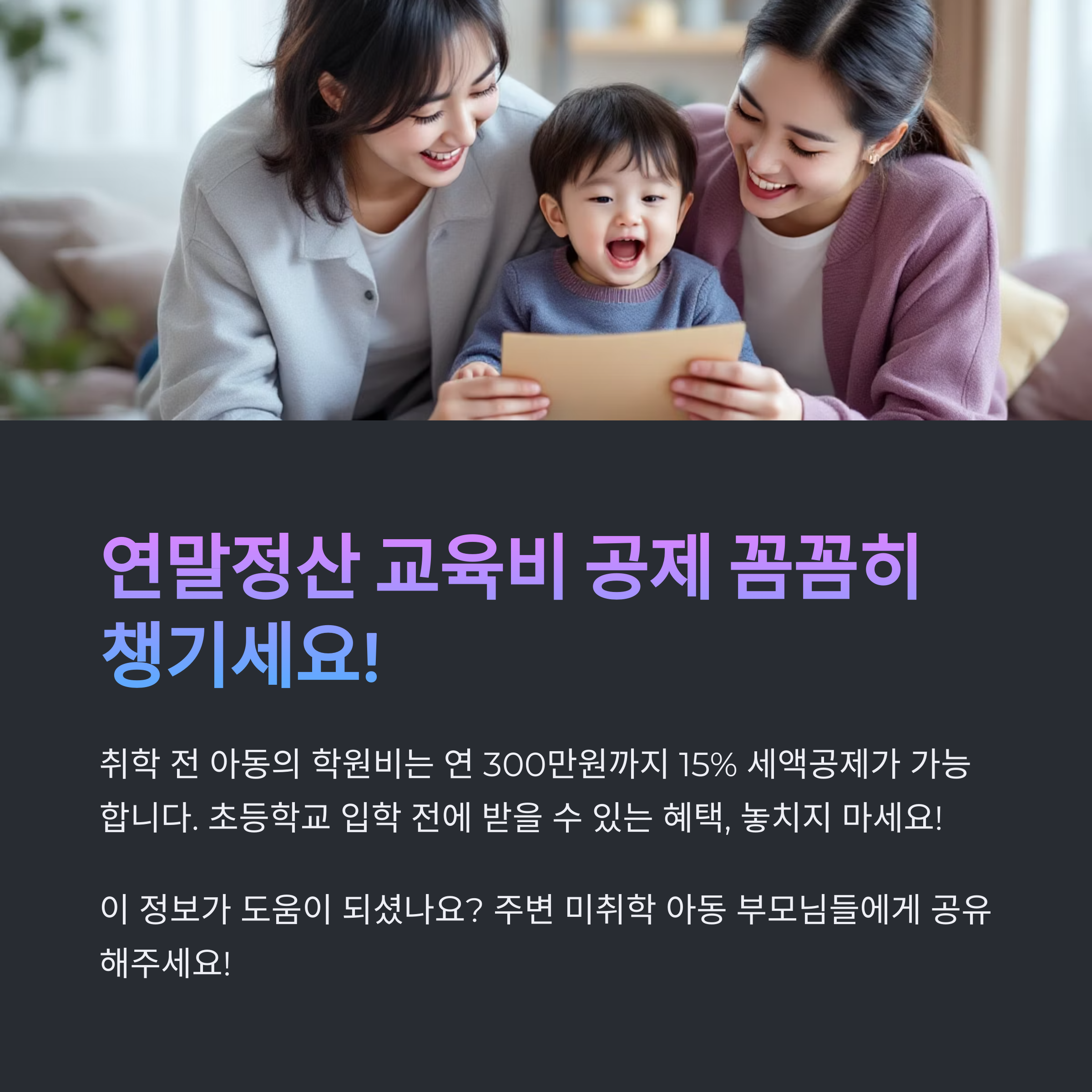 | 취학 전 아동 | 가능 | 연 300만 원/인 | 정식 학원, 주 1회 이상 수업, 증빙 필요 |