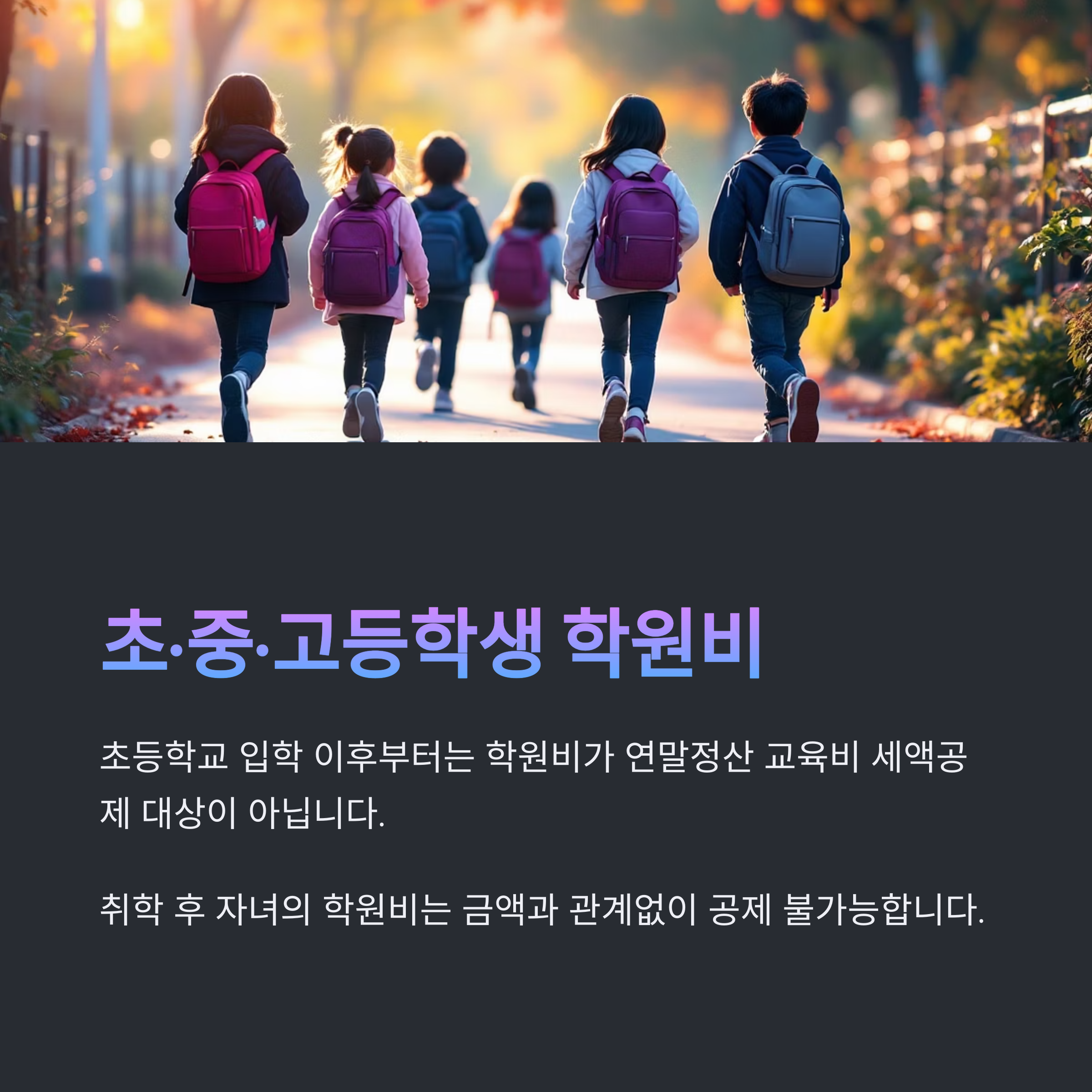 | 초·중·고등학생 | 불가 | 해당 없음 | 연말정산에서 학원비 공제 불가능 |