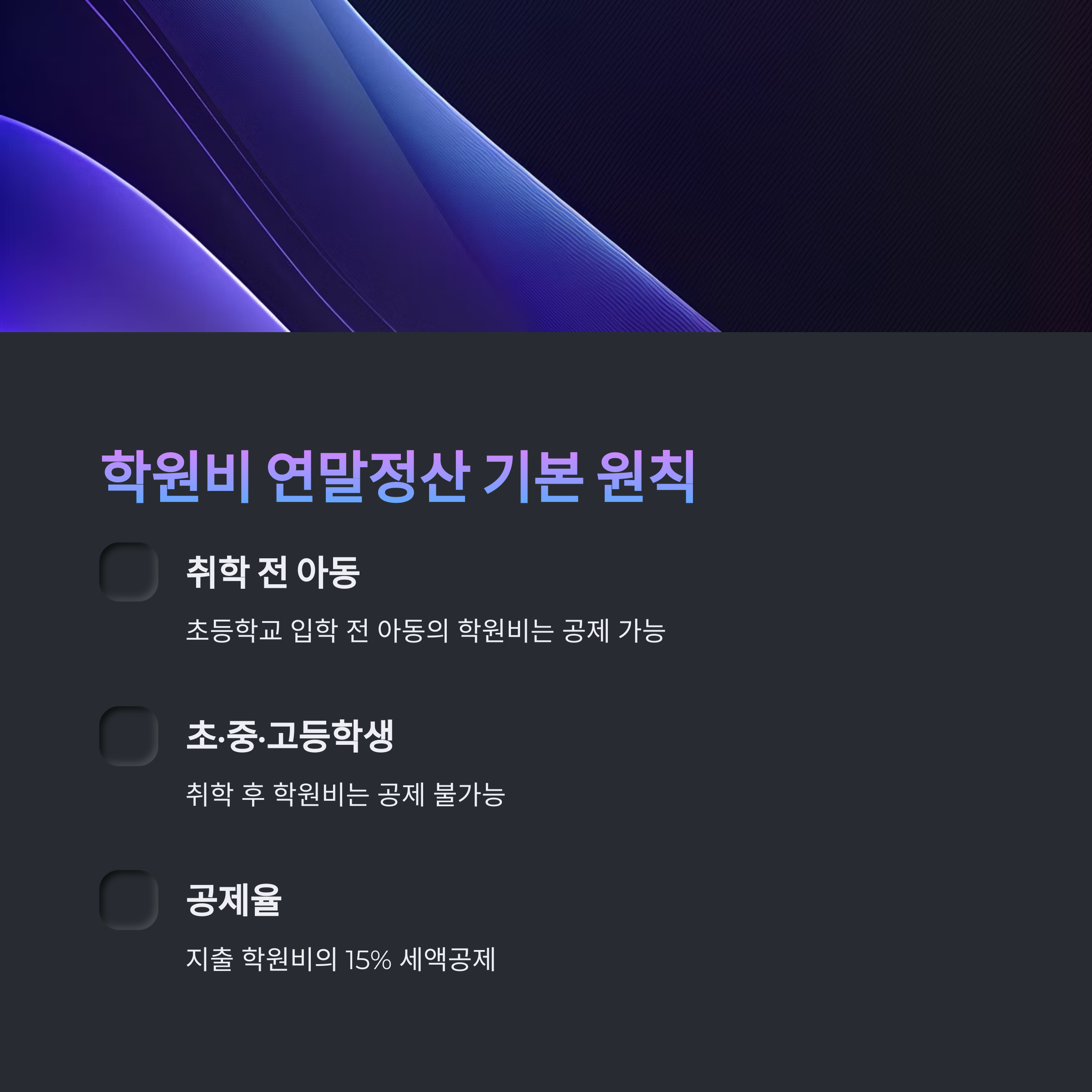 자녀 학원비의 연말정산 공제 여부는 취학 여부에 따라 확연히 다르며, 증빙 서류 준비도 중요합니다.