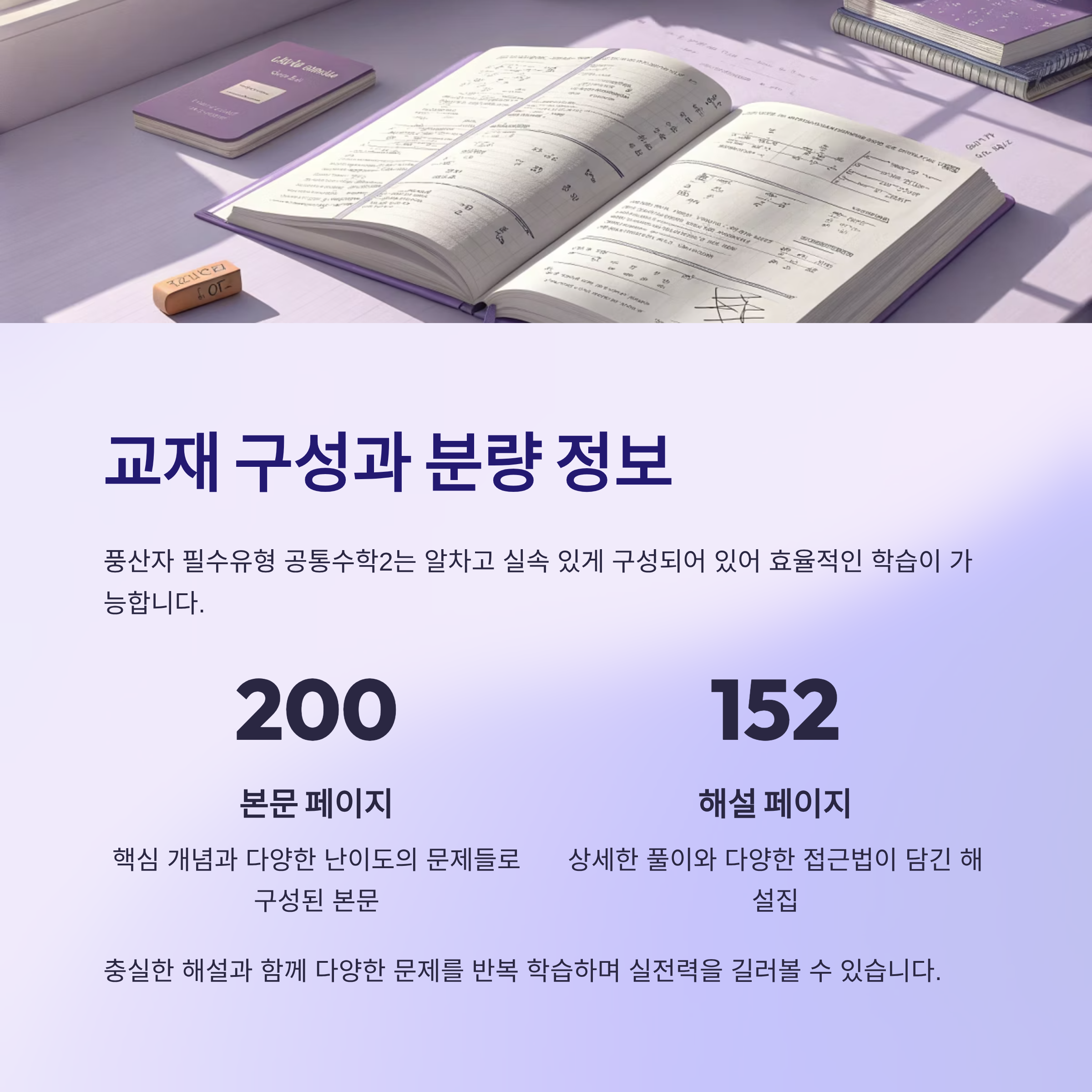풍산자 필수유형 공통수학2는 2022 개정 교육과정을 충실히 반영하여, 내신 및 수능을 모두 대비할 수 있도록 구성된 수학 유형 특화 교재입니다. 기출 중심의 대표 문제로 구성되어 있으며, 개념→유형→서술형 문제로 이어지는 구조와 함께 풍쌤 비법, 다양한 풀이 방식이 학습자 스스로 개념을 체득하고 응용력을 높일 수 있도록 돕습니다. 정답 및 해설 PDF는 공식 사이트와 자료 공유 블로그에서 확인 가능합니다.