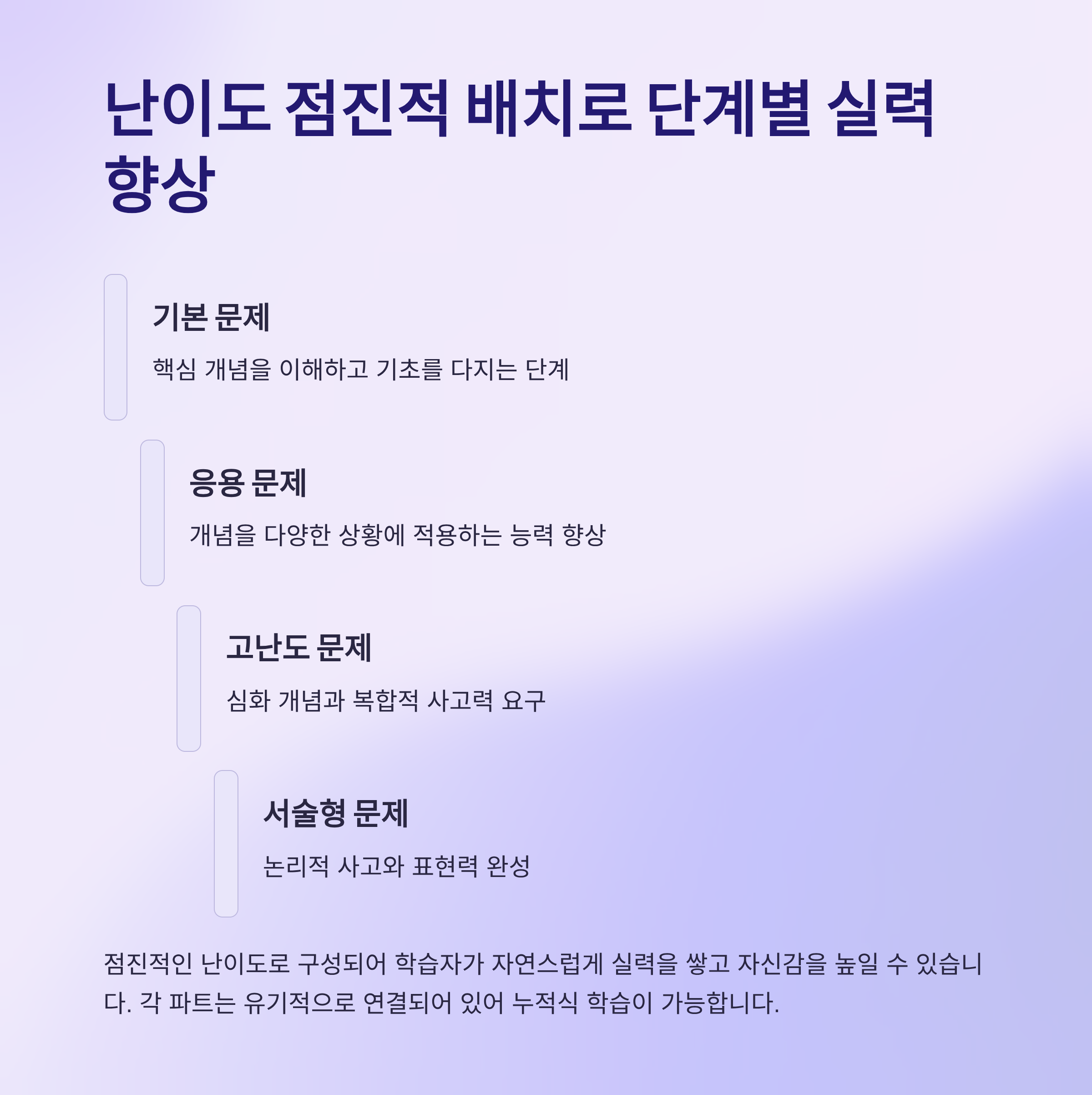문제는 기본 → 응용 → 고난도 → 서술형 순으로