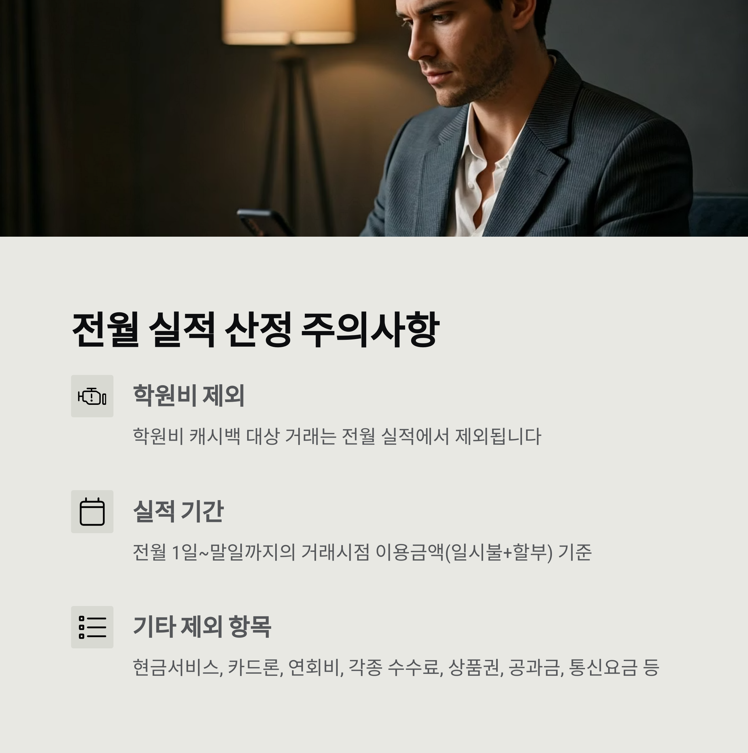 학원비 결제가 전월 실적에서 제외되기 때문에, 생활비나 통신비 등으로 실적을 채워야 합니다.