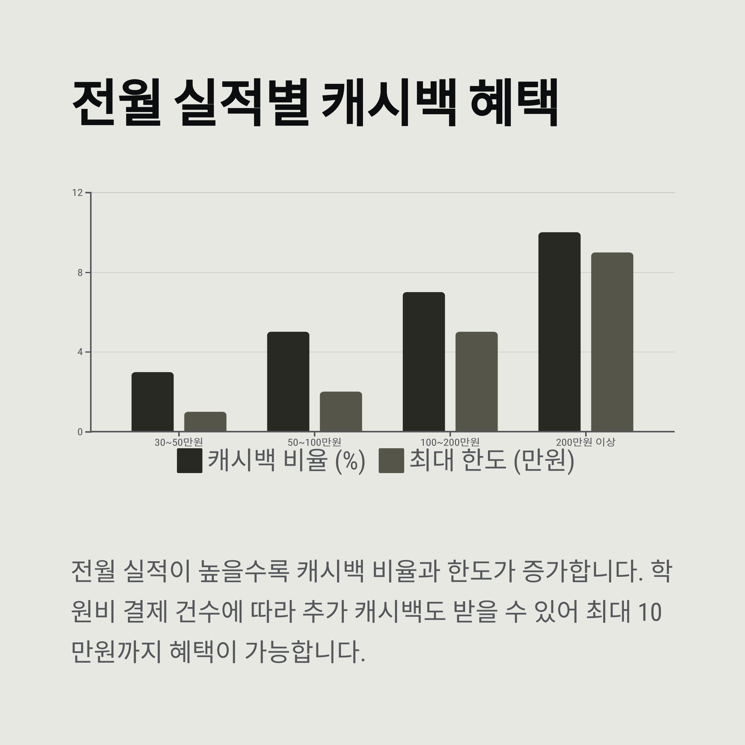 전월 이용 실적에 따라 최대 10%까지 학원비 캐시백이 가능하며, 결제 건수에 따라 추가 캐시백도 주어집니다.