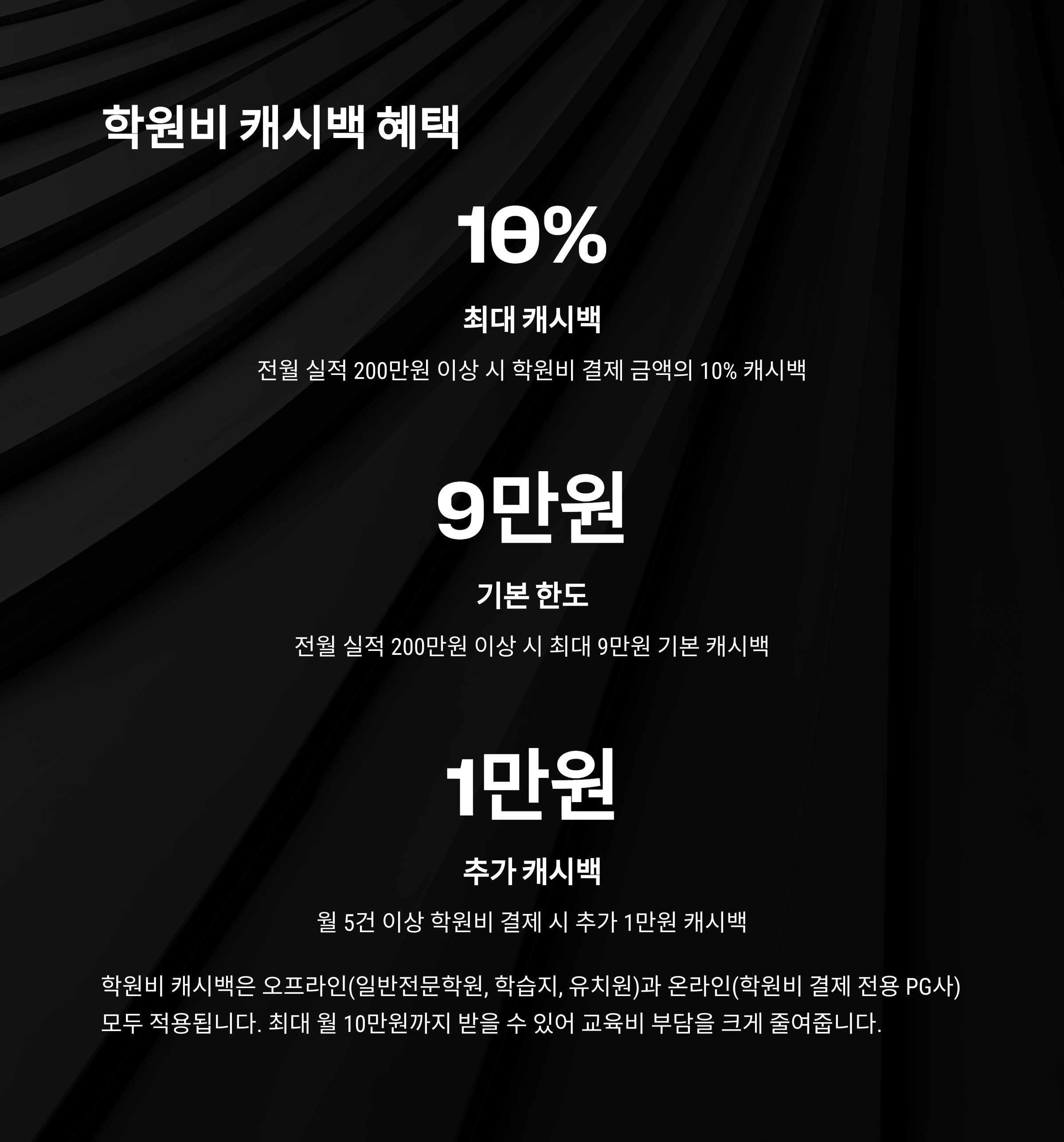 여기에 20만원 이상 학원비 결제를 5건 이상 할 경우 추가 1만원까지 가능하여, 최대 월 10만원 캐시백도 현실적인 옵션입니다.