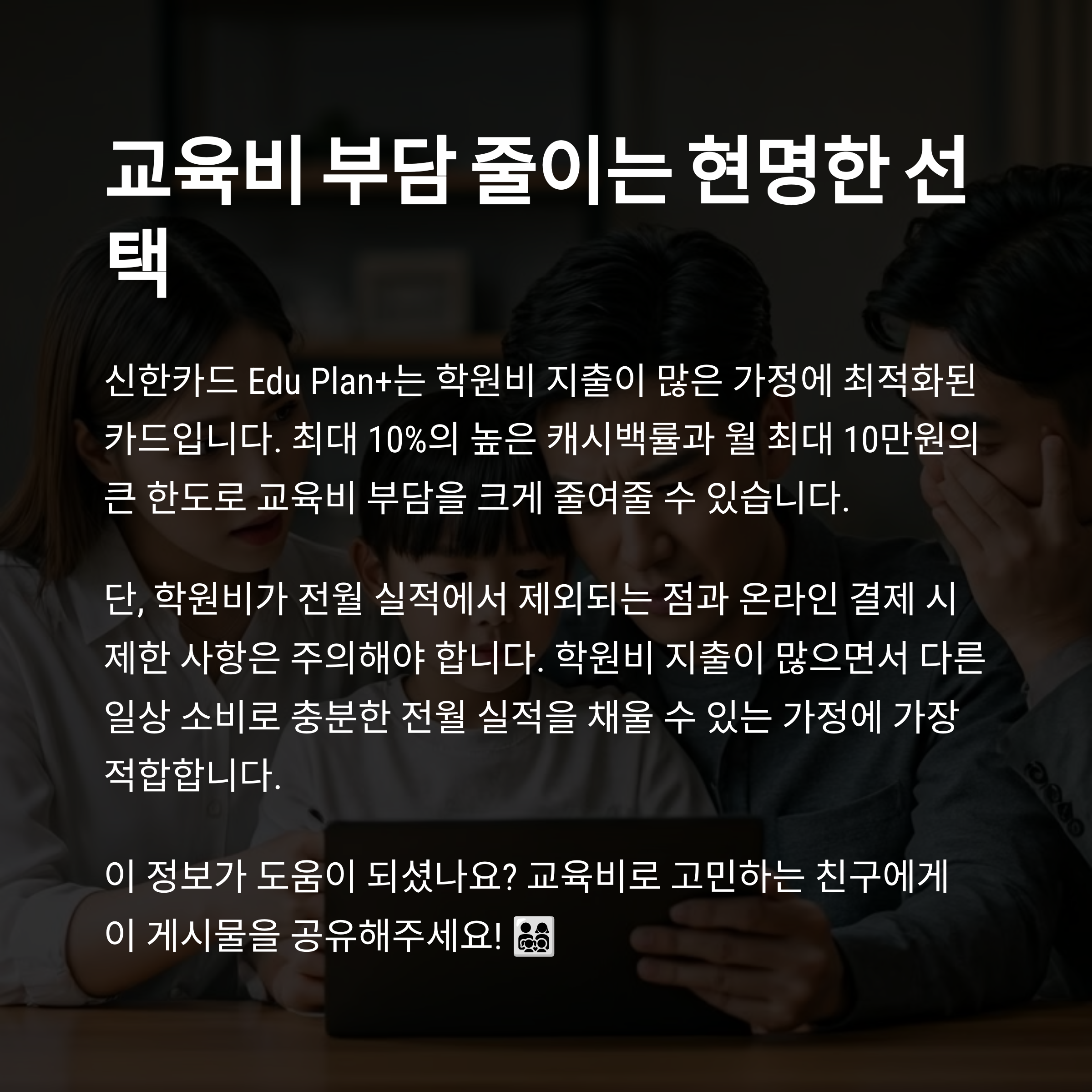 신한카드 Edu Plan+는 단순한 학원비 할인 카드를 넘어, 가정의 지출 구조에 실질적인 절감을 제공하는 카드입니다.