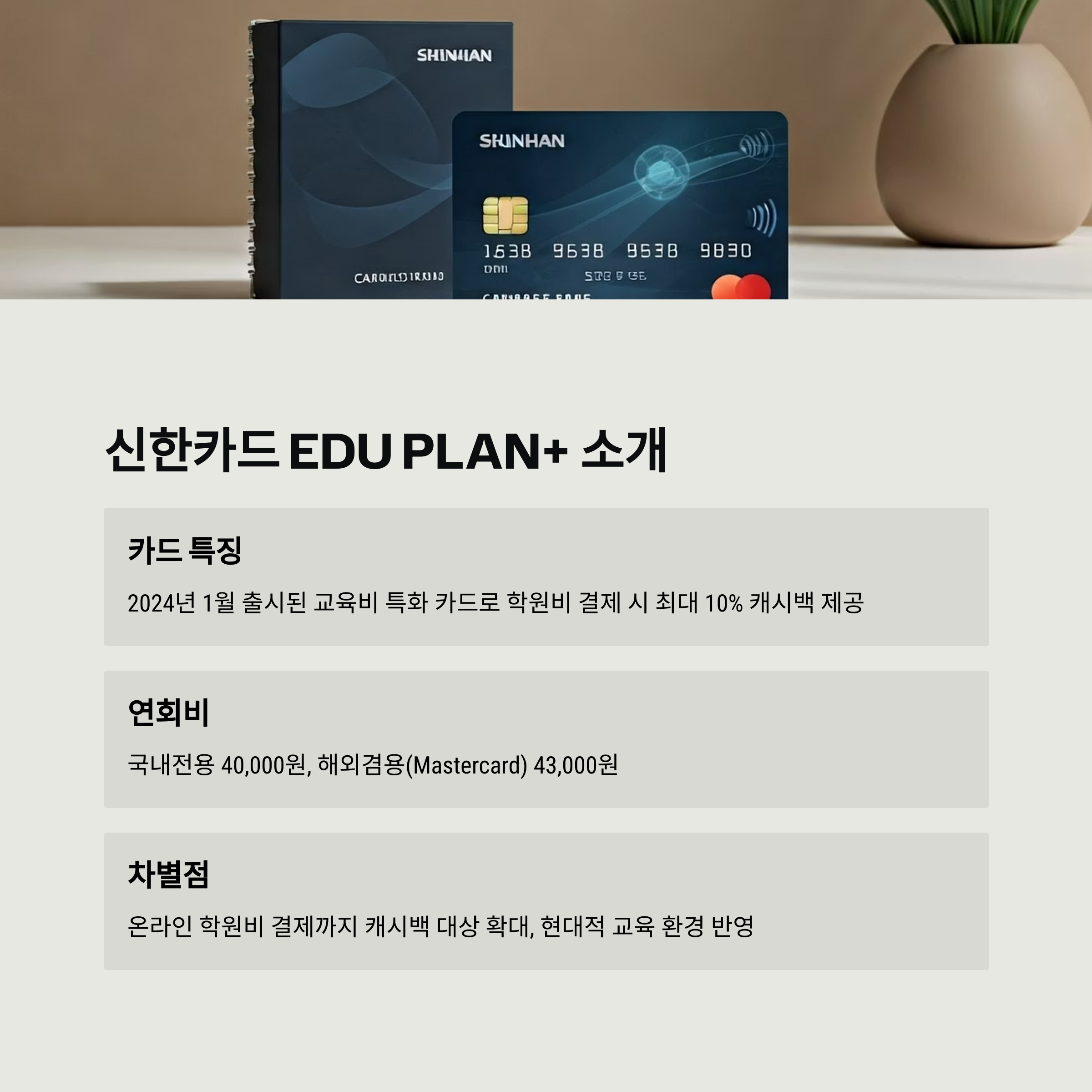 신한카드 Edu Plan+는 단순한 학원비 할인 카드를 넘어, 가정의 지출 구조에 실질적인 절감을 제공하는 카드입니다.