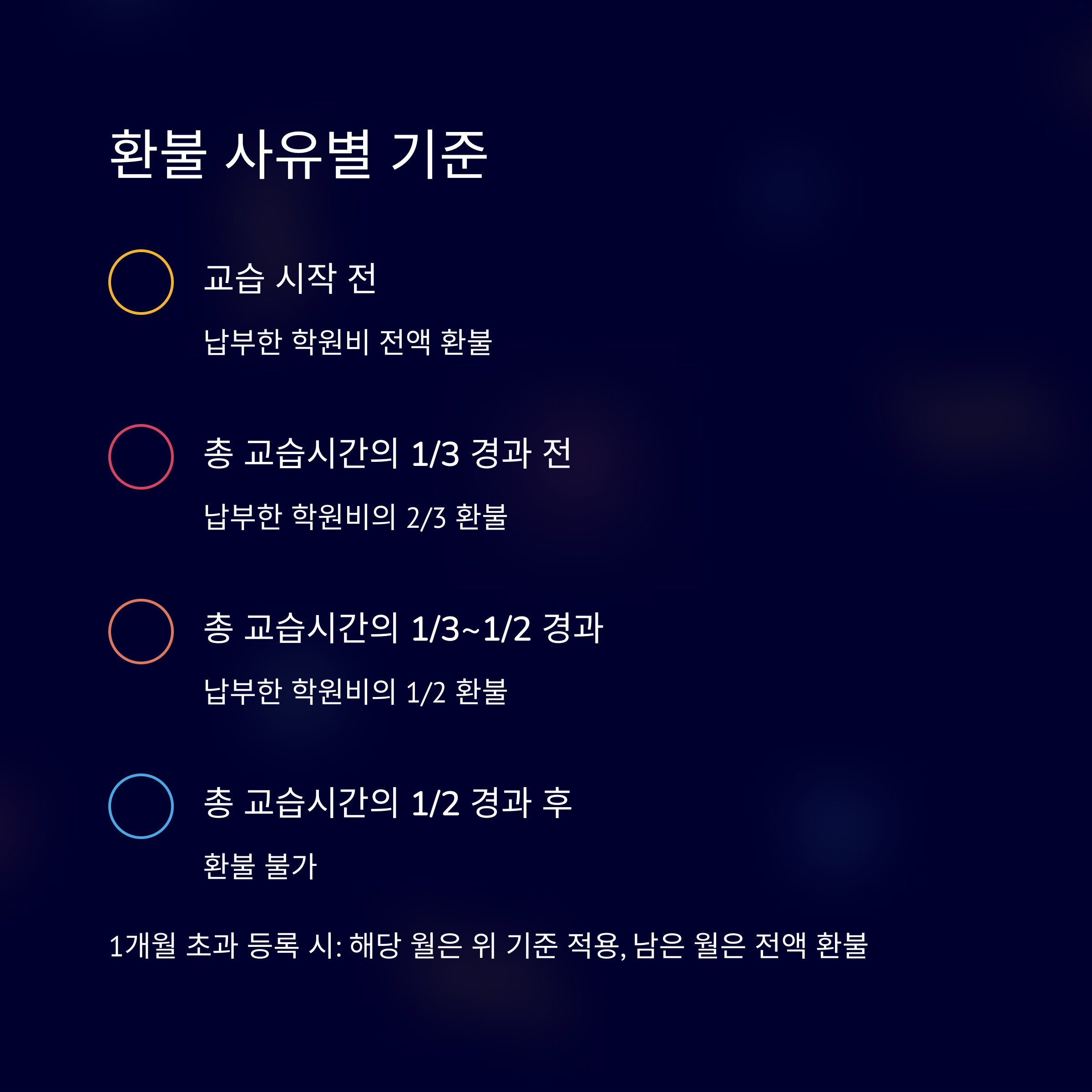 1개월 초과 수강 등록의 경우, 환불 사유가 발생한 해당 월은 위 기준을 적용하고 남은 월의 수강료는 전액 환불됩니다. 예를 들어, 3개월 등록 후 첫 달 중간에 환불을 요청하면 해당 월은 시간 비례로 계산하고, 나머지 2개월은 전액 환불됩니다.