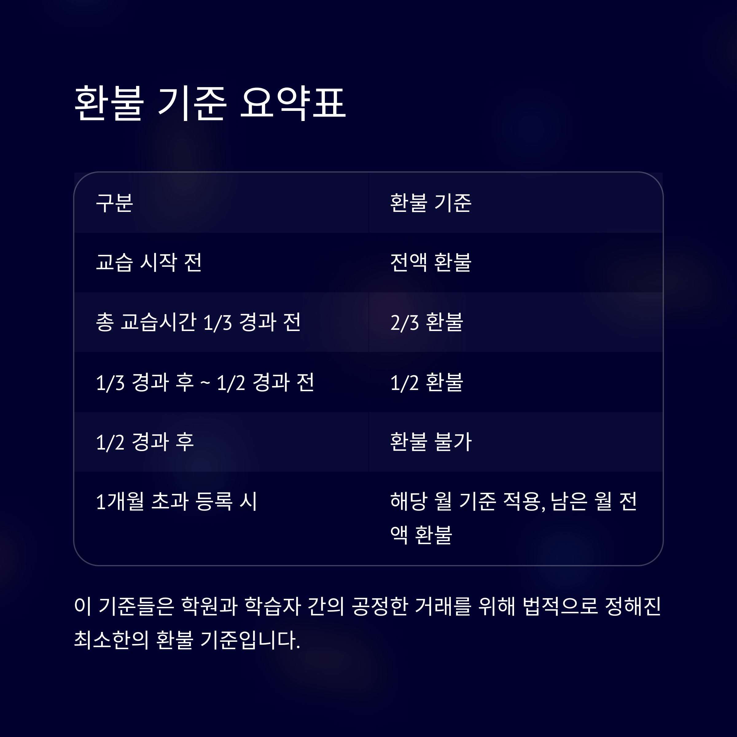 환불 기준은 총 교습시간 대비 경과 시간에 따라 정해집니다. 아래 표는 수강료 반환 기준을 정리한 것입니다.