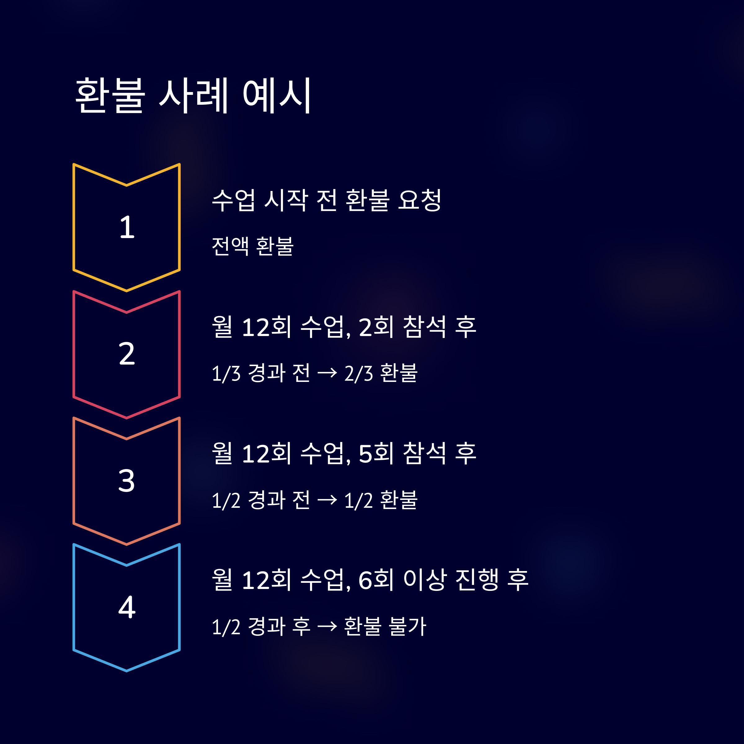 핵심: 실제 출석 여부와 무관하게 전체 수업 중 얼마나 시간이 지났는지가 기준입니다. 예를 들어 12회 수업 중 6회를 들었다면, 이미 절반을 넘겼다고 판단되어 환불이 어렵습니다.