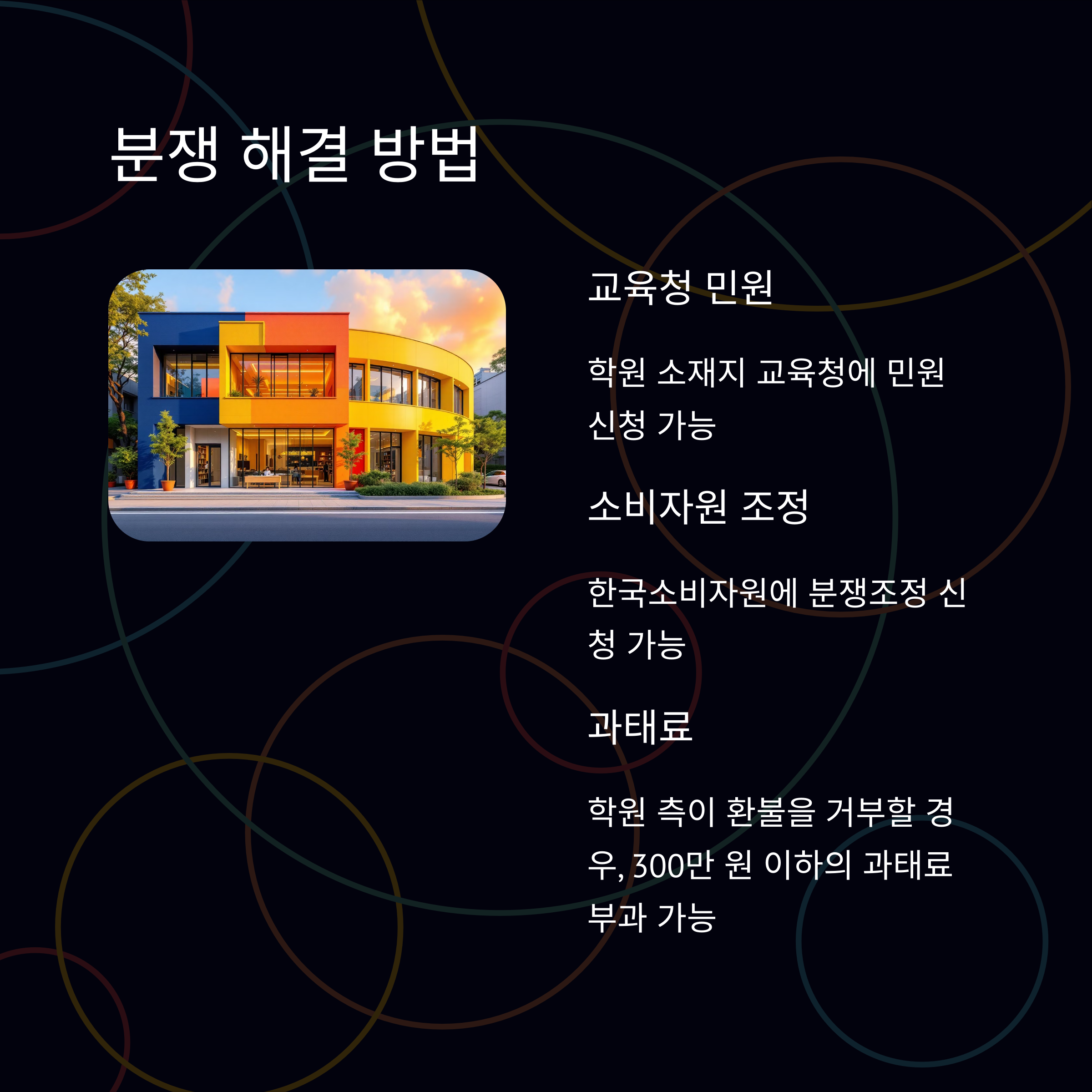 환불 거부나 지연으로 인한 갈등은 해당 학원 소재지 교육청 또는 한국소비자원에 신고하면 해결이 가능합니다.