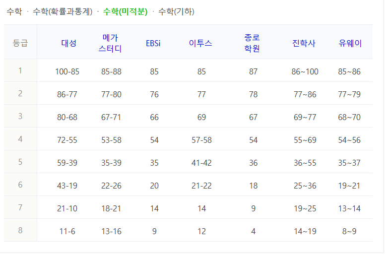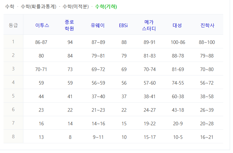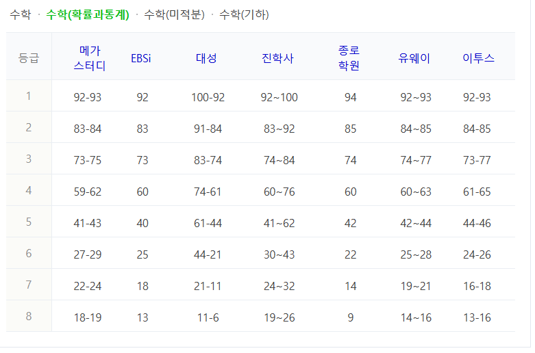 수학 등급컷 (확률과통계 / 미적분 / 기하)