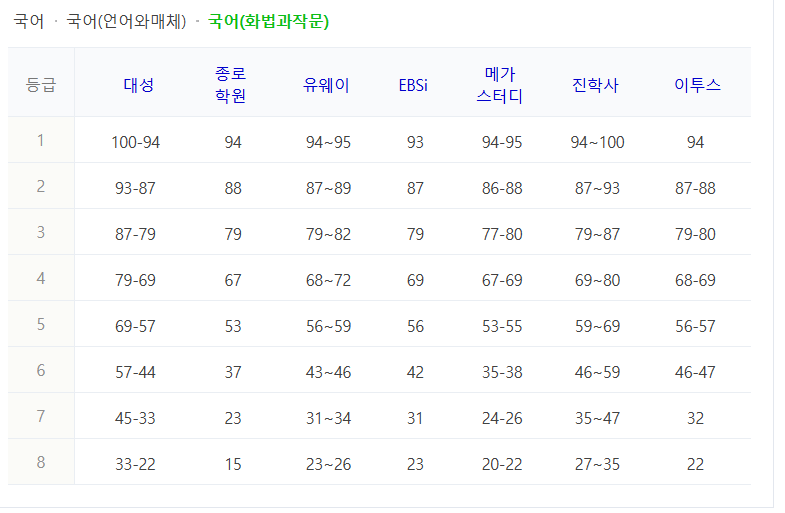 국어 등급컷 (언어와 매체 / 화법과 작문)