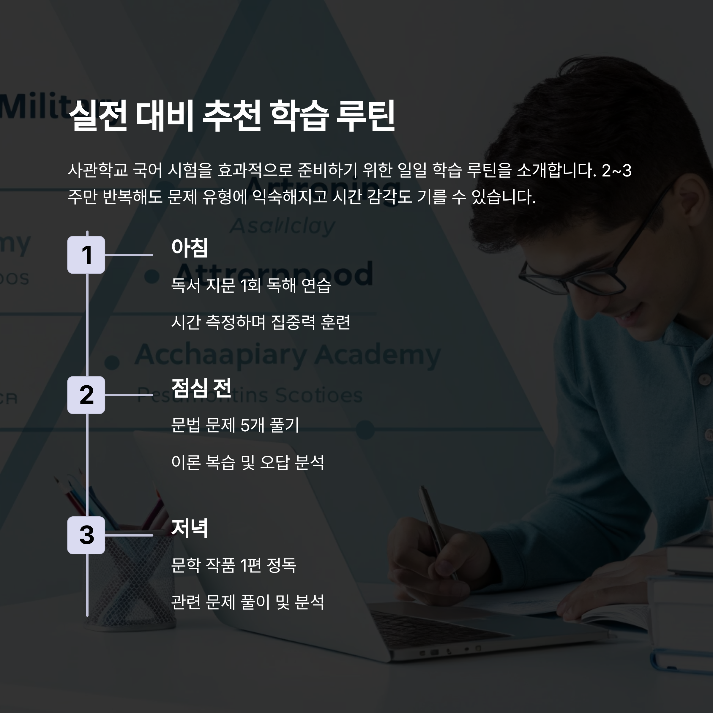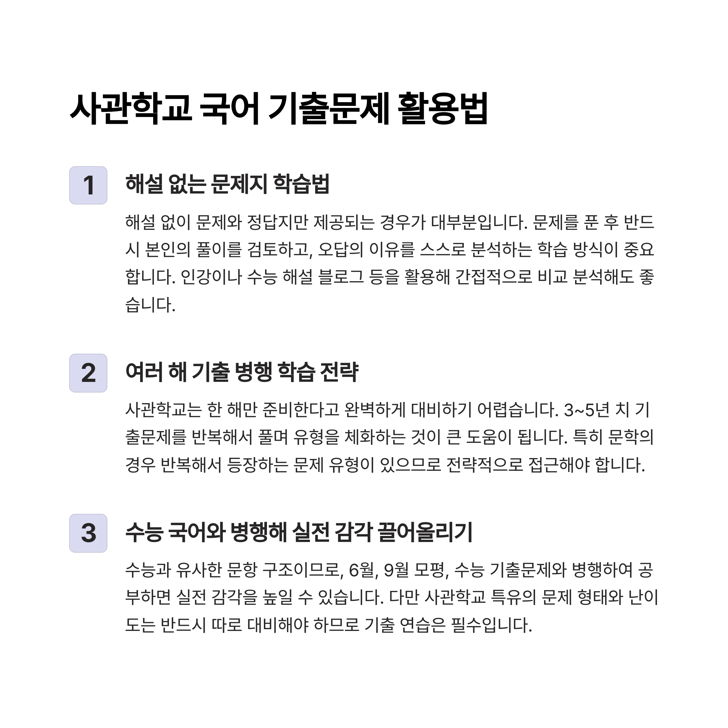 사관학교는 한 해만 준비한다고 완벽하게 대비하기 어렵습니다. 3~5년 치 기출문제를 반복해서 풀며 유형을 체화하는 것이 큰 도움이 됩니다. 특히 문학의 경우 반복해서 등장하는 문제 유형이 있으므로 전략적으로 접근해야 합니다.