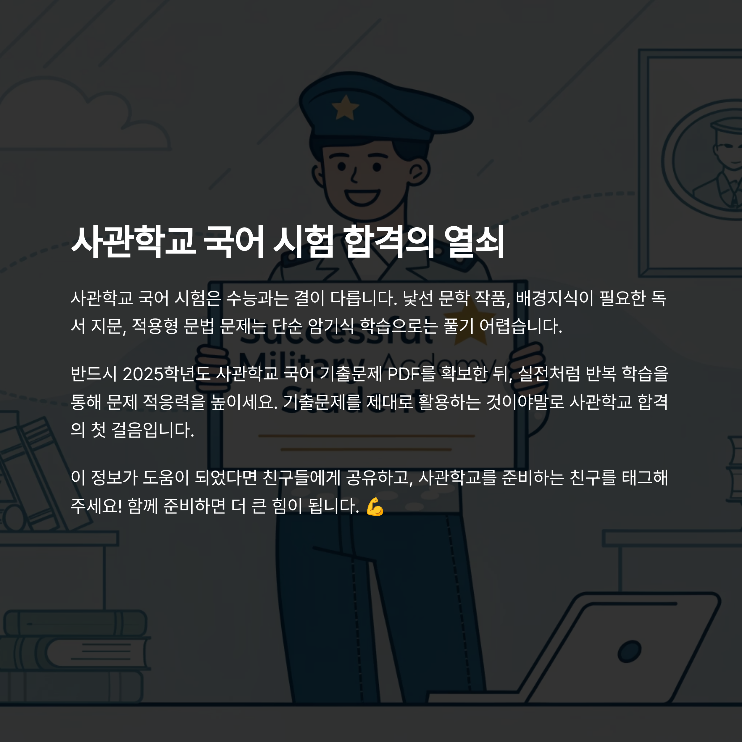 사관학교 국어 시험은 수능과는 결이 다릅니다. 특히 낯선 문학 작품, 배경지식이 필요한 독서 지문, 적용형 문법 문제는 단순 암기식 학습으로는 풀기 어렵습니다. 반드시 2025학년도 사관학교 국어 기출문제 PDF를 확보한 뒤, 실전처럼 반복 학습을 통해 문제 적응력을 높이세요.