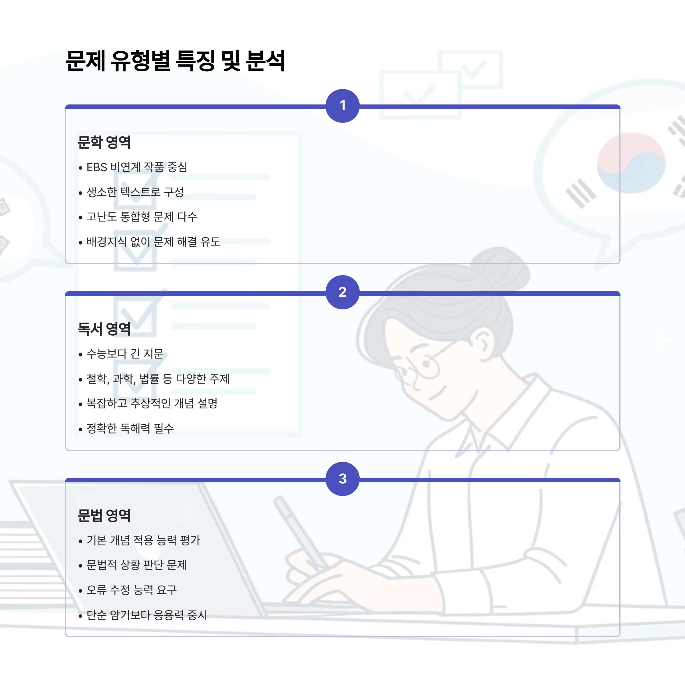 시험은 전통적인 수능 유형을 따르지만, 특정 지문이나 문제는 EBS 교재 연계율이 매우 낮아, 사관학교만의 출제 방향에 적응해야 합니다. 문학과 독서 영역에서는 익숙하지 않은 지문과 구성 방식을 통해 수험생의 응용력과 사고력을 평가하려는 경향이 강하게 나타납니다.