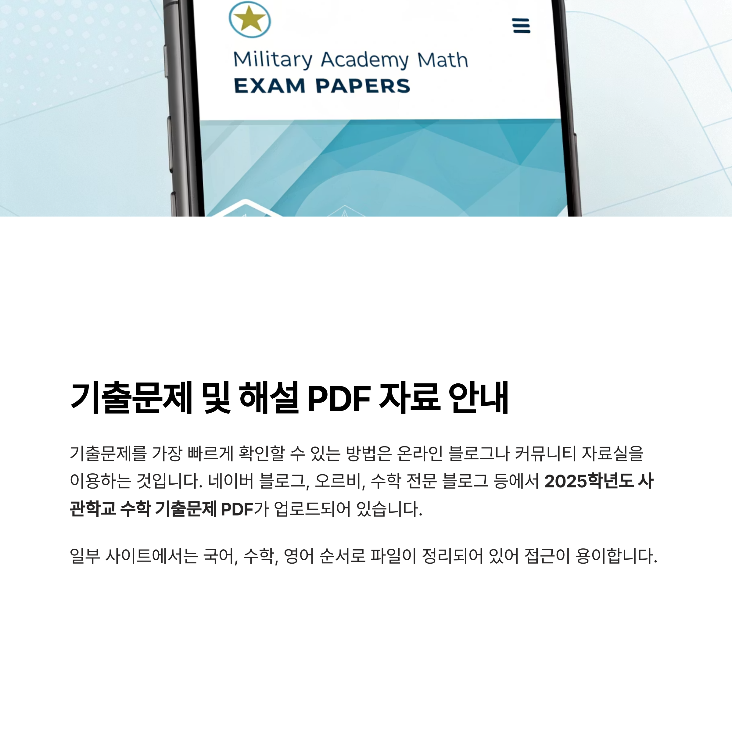 기출문제를 가장 빠르게 확인할 수 있는 방법은 온라인 블로그나 커뮤니티 자료실을 이용하는 것입니다. 네이버 블로그, 오르비, 수학 전문 블로그 등에서 2025학년도 사관학교 수학 기출문제 PDF가 업로드되어 있으며, 일부 사이트에서는 국어, 수학, 영어 순서로 파일이 정리되어 있어 접근이 용이합니다.
