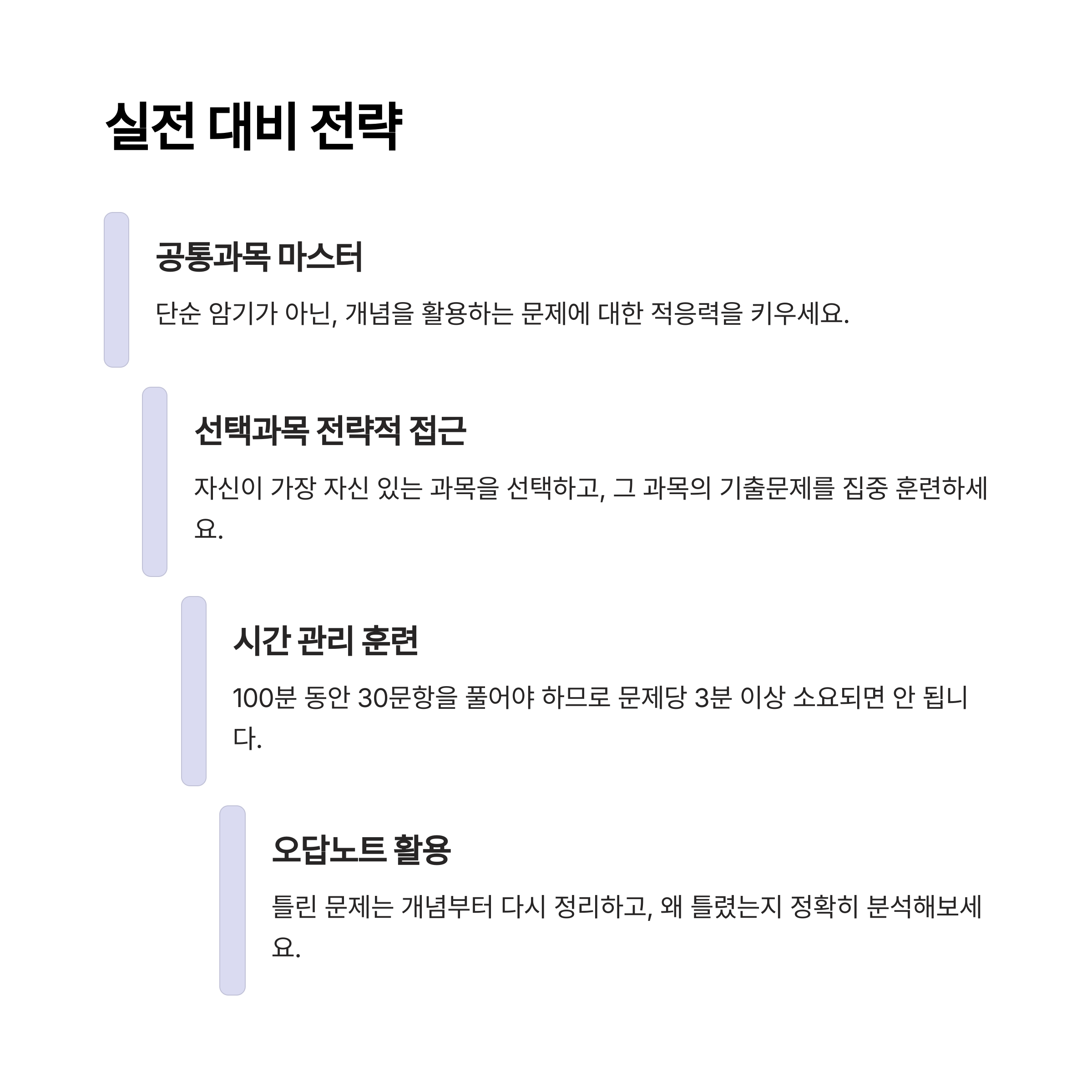 실전처럼 시간을 재면서 문제를 푸는 연습을 반드시 하세요. 100분 동안 30문항을 풀어야 하므로 문제당 3분 이상 소요되면 안 됩니다. - 오답노트를 만들어 반복 학습하세요.