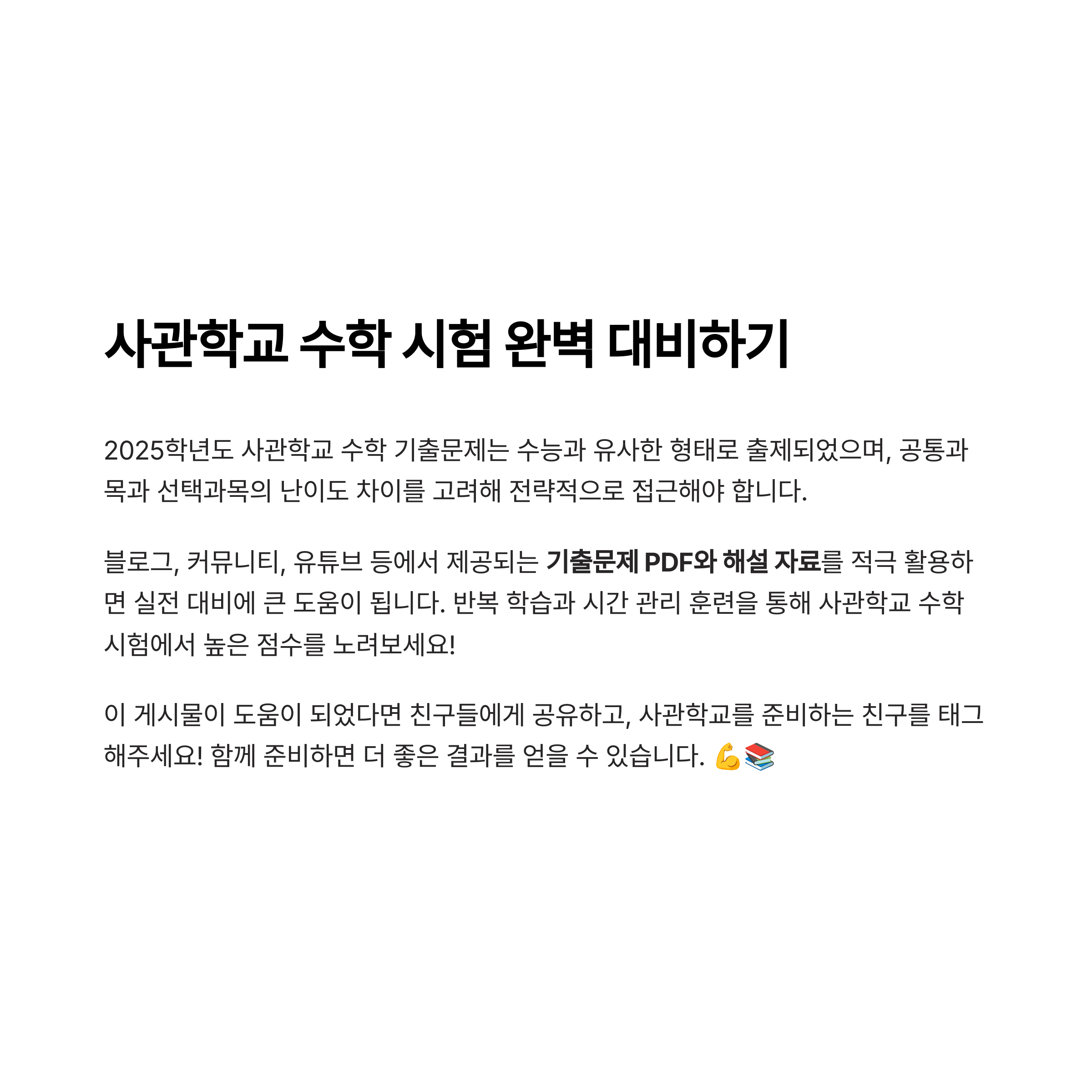 2025학년도 사관학교 수학 기출문제는 수능과 유사한 형태로 출제되었으며, 공통과목과 선택과목의 난이도 차이를 고려해 전략적으로 접근해야 합니다. 블로그, 커뮤니티, 유튜브 등에서 제공되는 기출문제 PDF와 해설 자료를 적극 활용하면 실전 대비에 큰 도움이 됩니다. 반복 학습과 시간 관리 훈련을 통해 사관학교 수학 시험에서 높은 점수를 노려보세요!